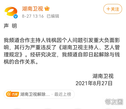 明明是湖南台把他开除了,看他自己发的声明,搞得好像是自己被诬陷不想连累湖南台似的