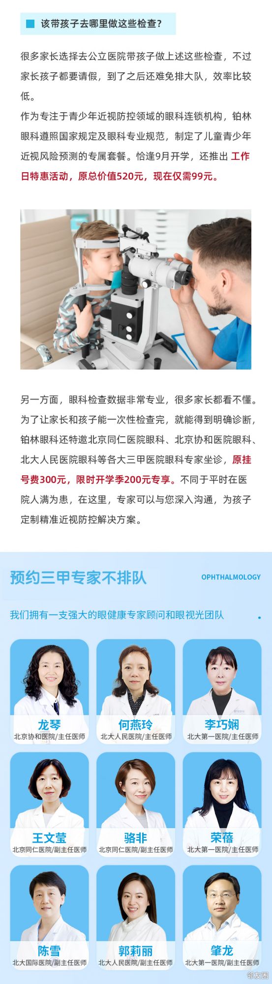 铂林眼科开学福利:1、青少年全面视光检查周中特惠仅需99元(周一至周五 原价520元)2、免排队预约三甲眼科专家仅需200元(原价300元)活动时间:2021年9月2日-2021年9月30日门诊时间:9:00-20:00年龄范围:5-18岁儿童青少年咨询电话:4006905366门诊地址:北京7家门诊通用(望京/亮马桥/朝阳门/知春里/平乐园/万柳/五路居/世纪城)使用须知:报名成功后在“活动/订单”页面查看门诊电话及时预约到诊时间,工作人员会电话预约到店时间,请注意接听电话《医疗广告审查证明》文号:(京)医广【2020】第04-16-0347号【咨询方式】如您在报名中遇到任何问题,请随时与邻友圈客服小编联系(微信号:linyouquan666)在各大应用市场或苹果AppStore搜索“邻友圈”,或点击下方链接,即可下载邻友圈APP下载地址:https://app.linyouquan.net/此活动与苹果公司无关