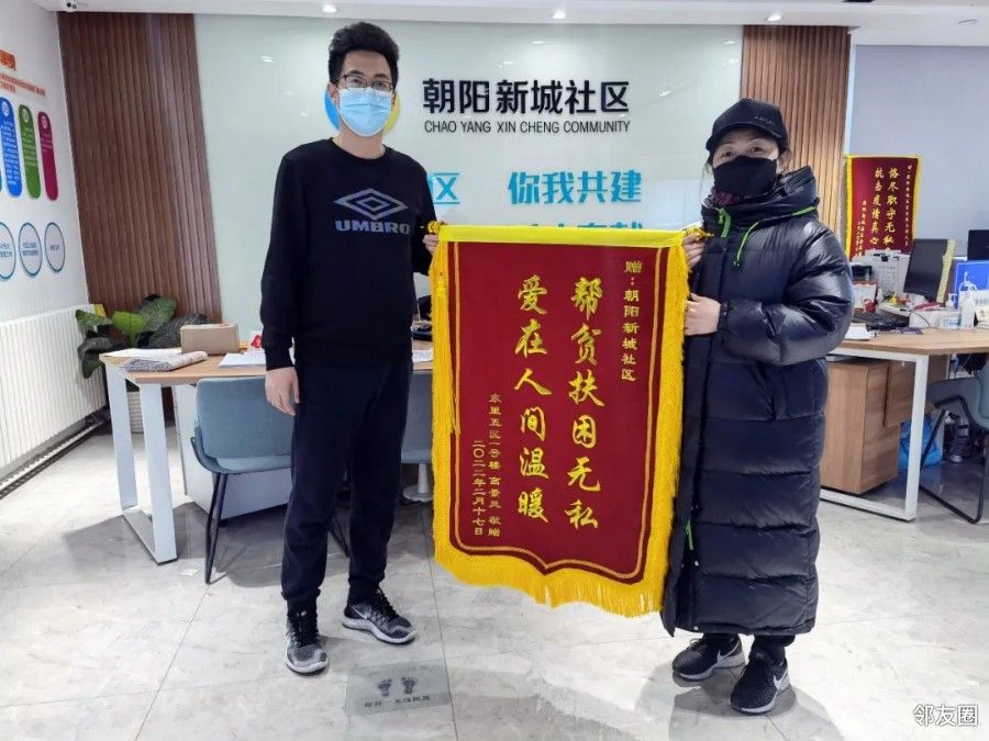 “多亏了你们的帮助,我们才有了今天的生活变化,真是太感谢你们了!”2月20日下午,在朝阳新城社区居委会里,居民高女士拉着工作人员的手连连道谢,并把一面印有“帮贫扶困无私 爱在人间温暖”几个金灿灿大字的锦旗送上,表达了高女士对社区工作人员心系困难群众的感激之情。