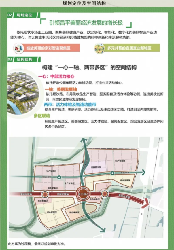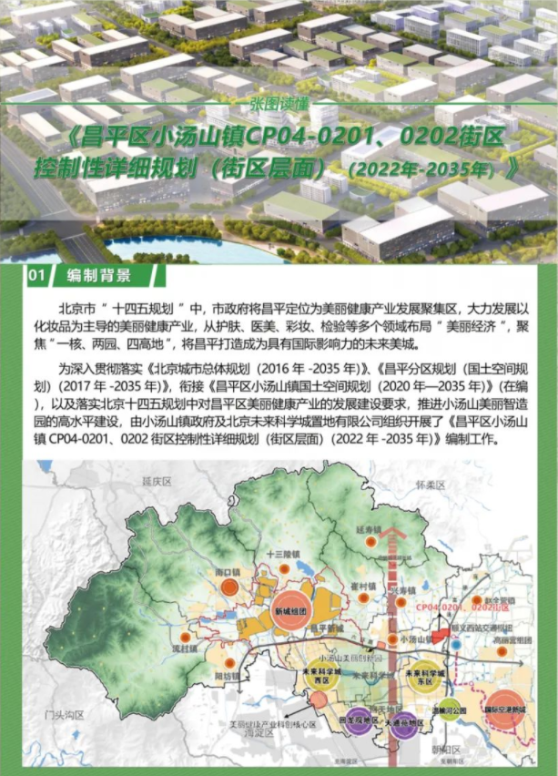 昌平区作为全市唯一的美丽健康产业发展聚集区,大力发展以化妆品为主导的美丽健康产业,打造具有国际影响力的未来美城。为支持美丽健康产业发展,提出产业空间供给政策,加强产业规划与土地空间规划协同联动,聚焦“一核、两园、四高地”,积极引导美丽健康领域企业和项目集中布局,打造北京美丽健康产业创新示范基地。小汤山美丽智造园(即小汤山镇CP04-0201街区)为“两园”之一,依托现状小汤山工业园,聚焦美丽健康产业,以定制化、智能化、数字化的美丽智造产业功能为核心,同时承担科技创新和生活服务功能;小汤山镇CP04-0202街区,为大东流生活片区,与小汤山镇CP04-0201街区共同承担起镇域东部的科技创新和生活服务功能。为贯彻落实《北京城市总体规划(2016年-2035年)》和《昌平分区规划(2017年—2035年)》的战略定位和系统要求,以及十四五规划中关于昌平区美丽健康产业发展指示,加快推进产业地块的供应,由小汤山镇政府和北京未来科学城置地有限公司,组织编制《昌平区小汤山镇CP04-0201、0202街区控制性详细规划(街区层面)(2022年-2035年)》。《北京市城乡规划条例》(2019年)、《北京市控制性详细规划编制技术标准与成果规范(修订版)》、《北京市居住公共服务设施配置指标》(京政发〔2015〕7号)、《北京城市总体规划(2016—2035 年)》、《北京市土地利用总体规划(2016 年—2035 年)》、《昌平分区规划(国土空间规划)(2017年—2035年)》、《北京市乡镇集中建设区控规性详细编制技术标准与成果规范(征求意见稿)》、《昌平区小汤山镇国土空间规划(2020年-2035年)》(在编)以及各类专项规划与专题研究等。小汤山镇CP04-0201、0202街区位于昌平区小汤山镇东部,六环路以北,京承高速以西,与顺义区相邻,距离未来科学城东区约5公里,总面积约318公顷。涉及小汤山镇大东流村、南官庄村、赖马庄村、西官庄村、东官庄村五个村。规划总用地面积约318.12公顷,规划全部为城乡建设用地,其中居住用地不高于43.06公顷,产业用地不高于131.78 公顷,三大设施用地(公共服务设施、交通与市政基础设施、城市安全设施)不低于25.73公顷,绿地与广场用地不低于44.15公顷,特殊用地1.65公顷,城市道路用地约为71.85公顷。