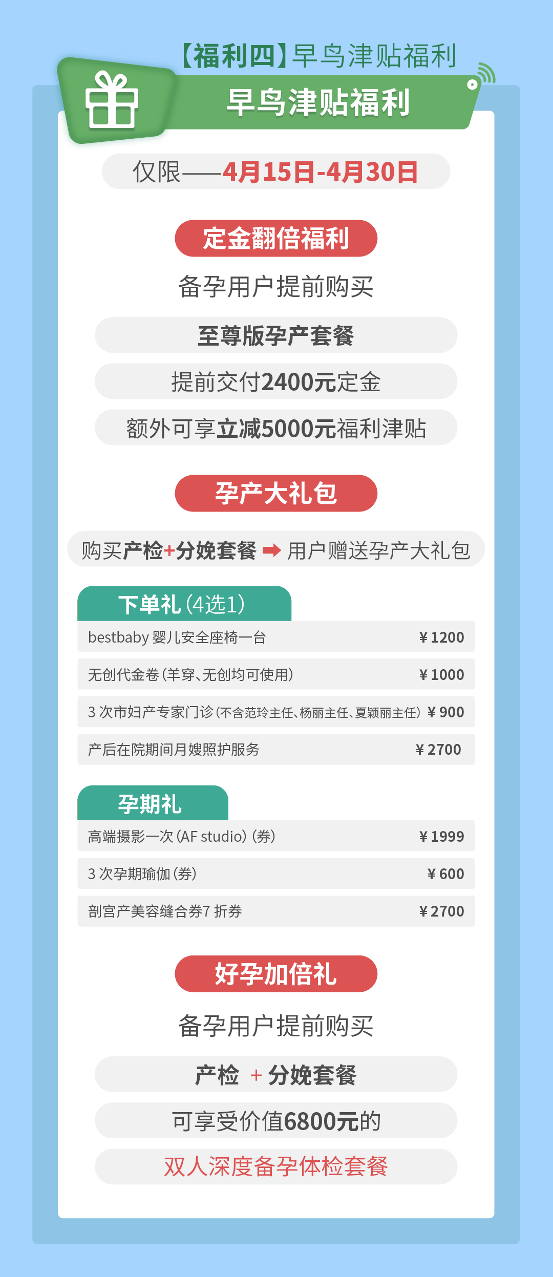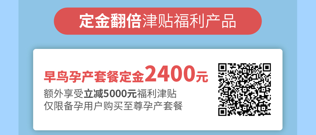 ①4月15日-5月30日备孕期间,交付2400元至尊套餐定金,即可享受至尊套餐产检+顺产立减5000元优惠;