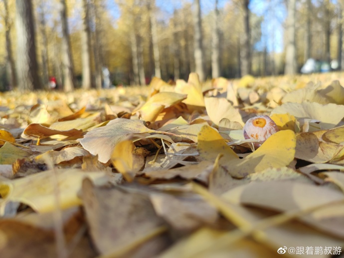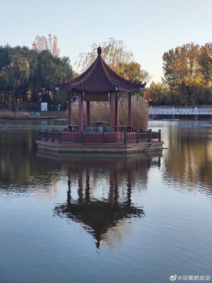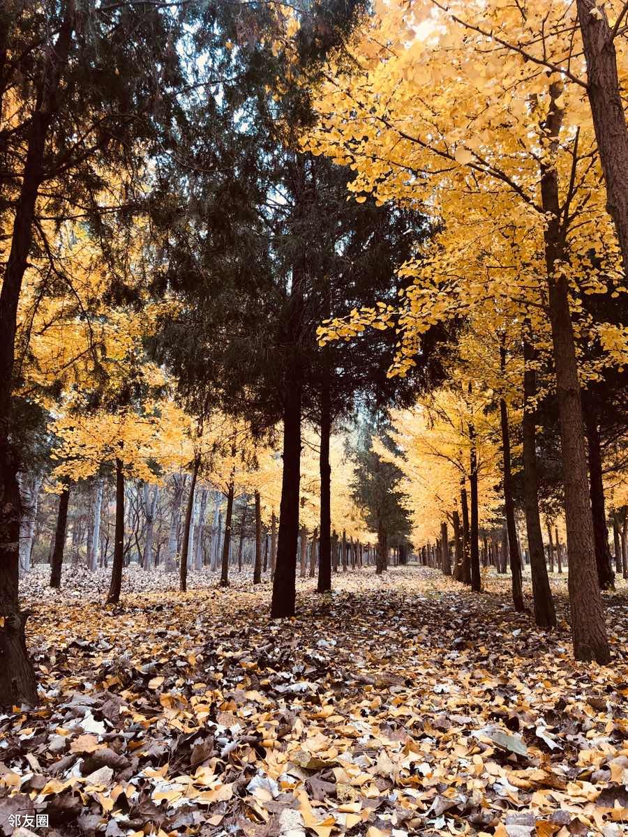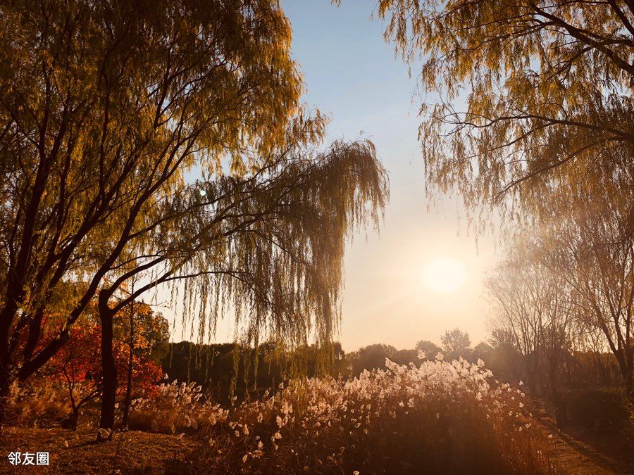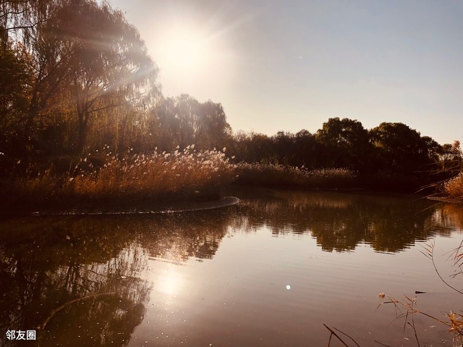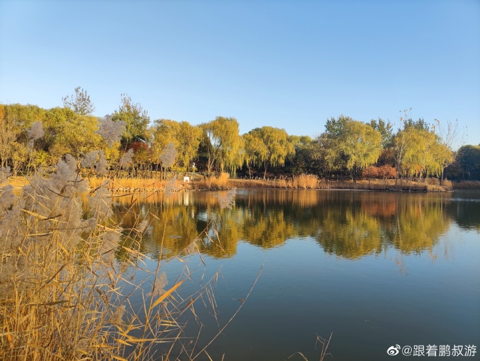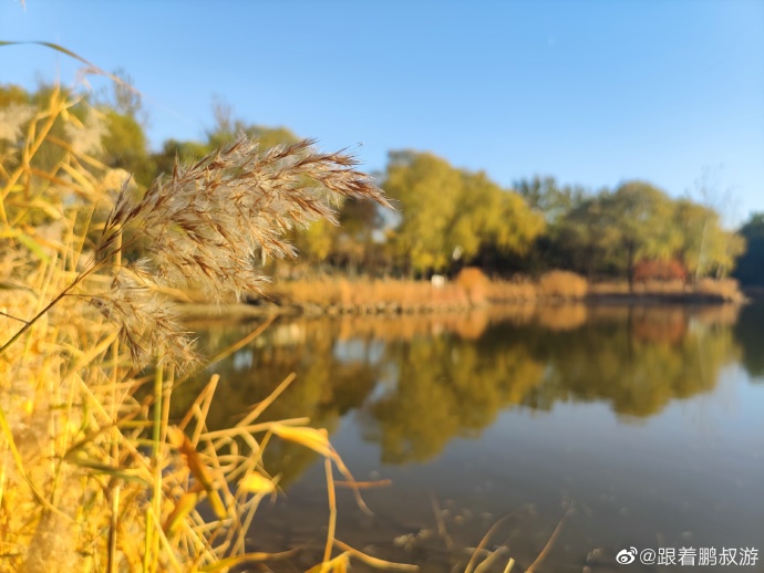 蓝天白云黄叶,漂亮,能明显感觉到了秋天的尾巴。北京的秋天就是这么短暂。除了银杏林,别忘了还有一片人工湖,有漂亮的芦苇荡和湖中凉亭。