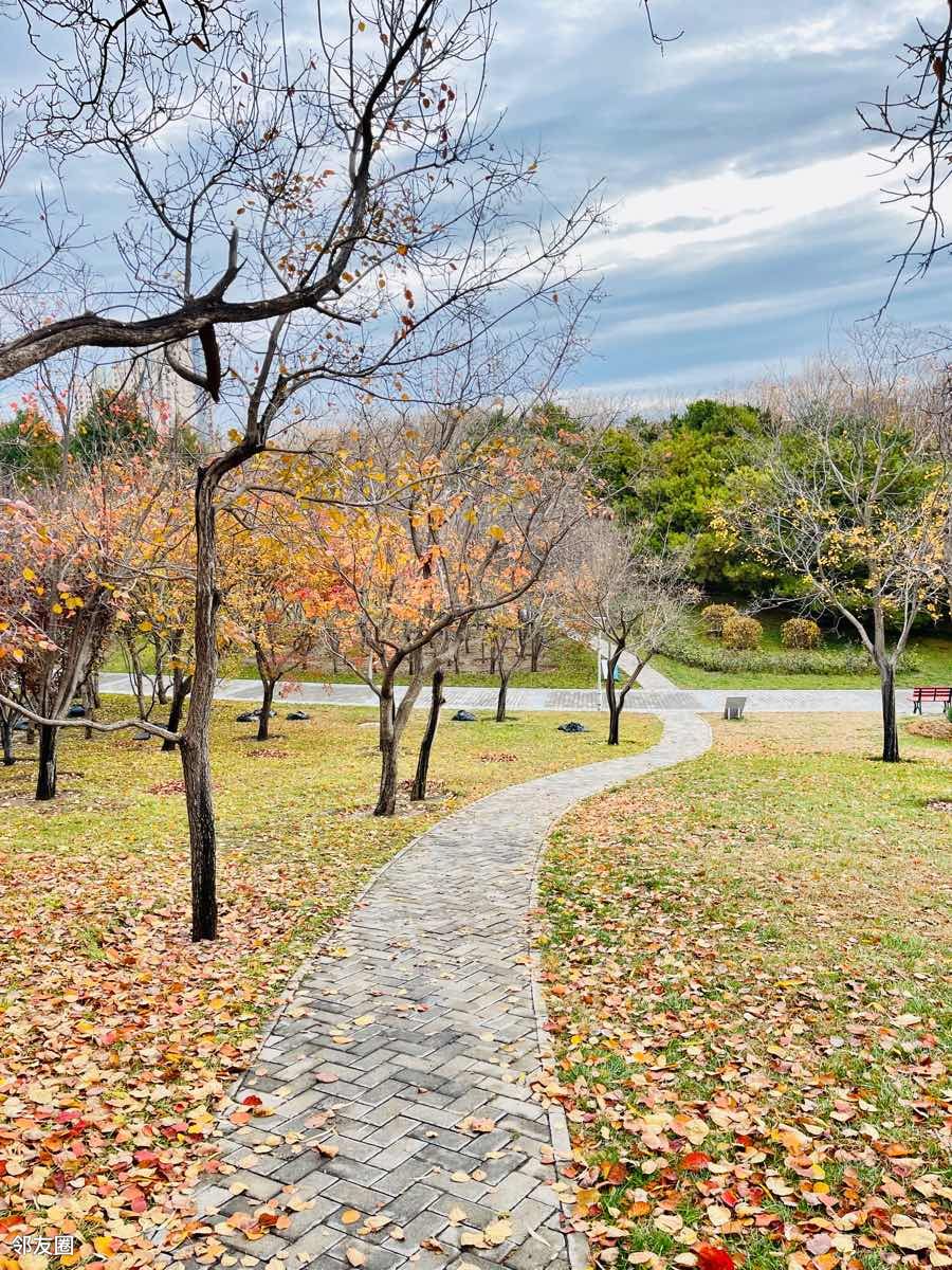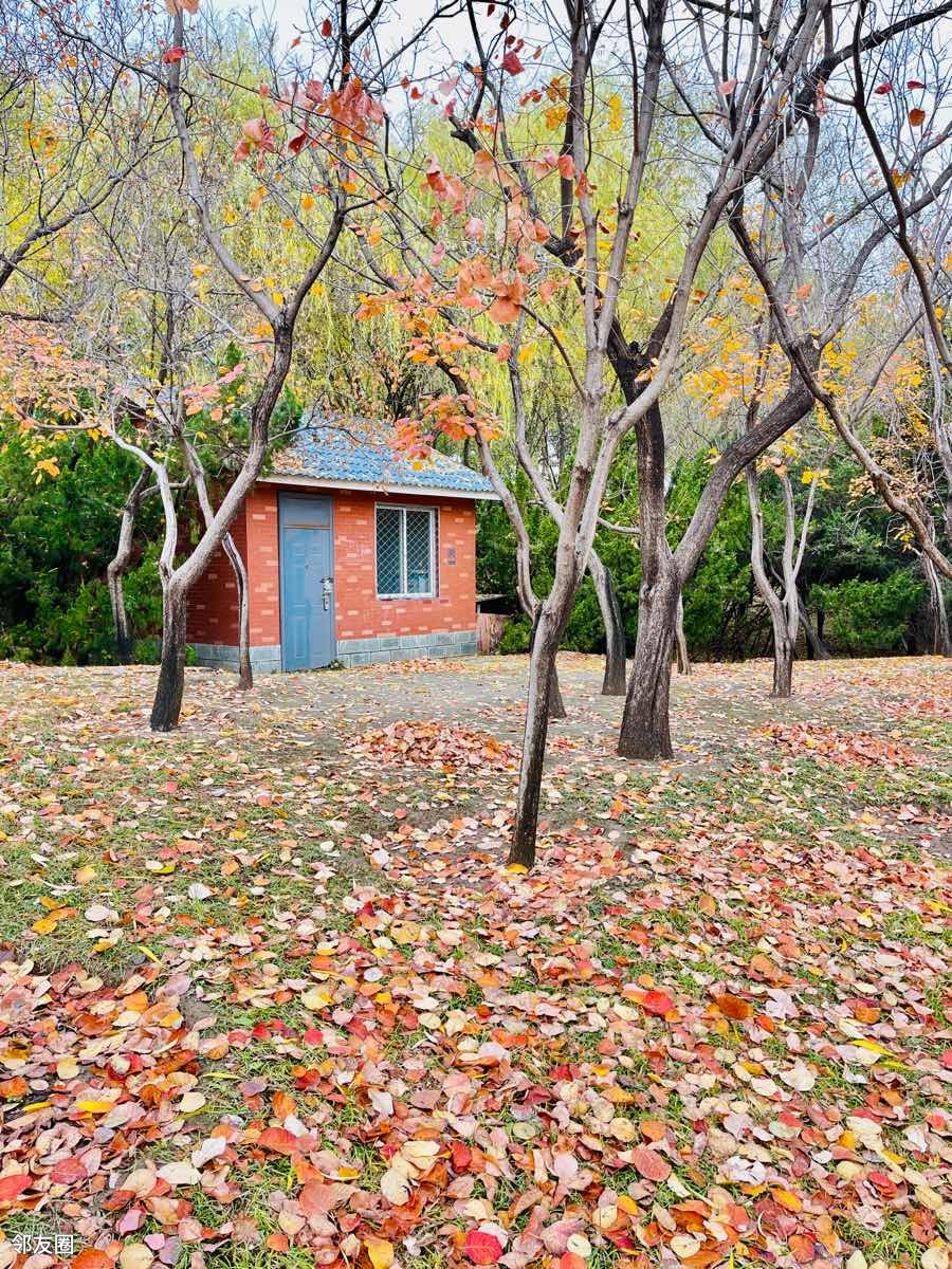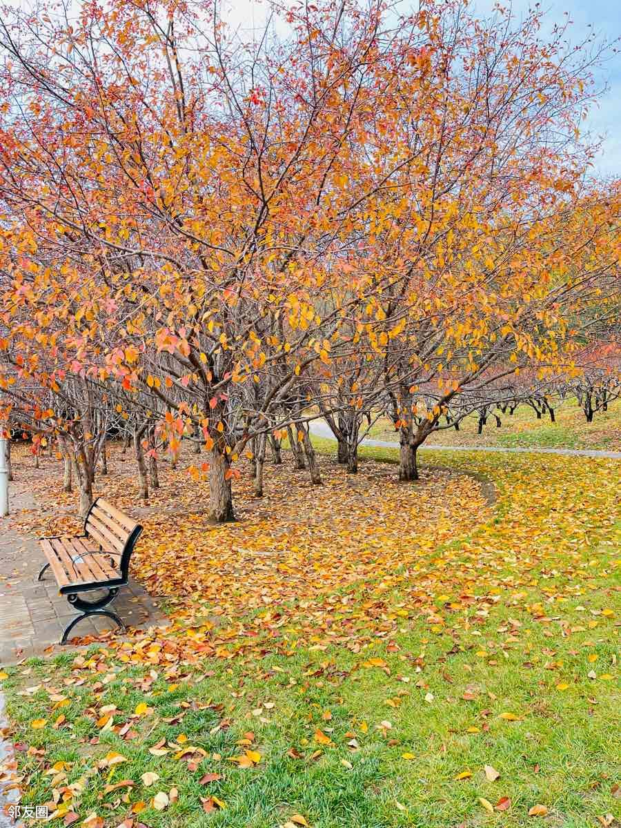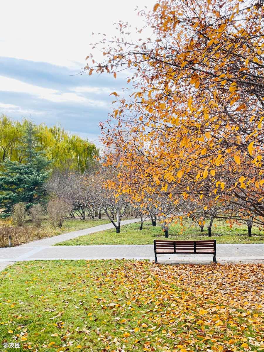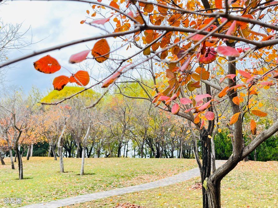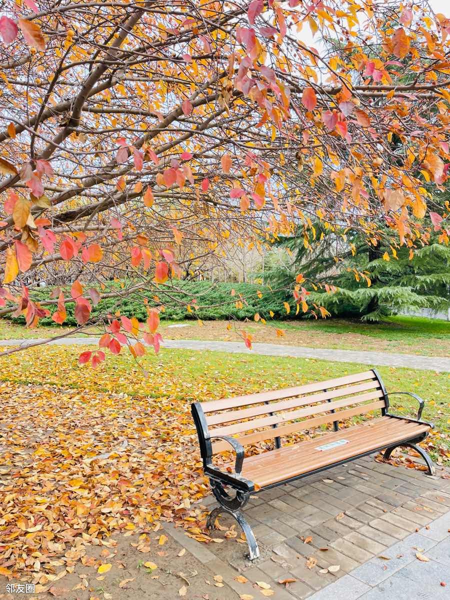 初冬的早晨,北小河公园内落叶缤纷,五彩斑斓,橘黄、橙红、黄金色、枣红色、青绿色,挂在枝头,一阵风吹过,给大地铺上了彩色的地毯。最使一年秋好处,彩叶枝头迎风舞,半是秋景半是冬 。