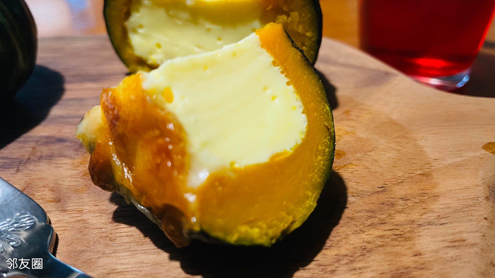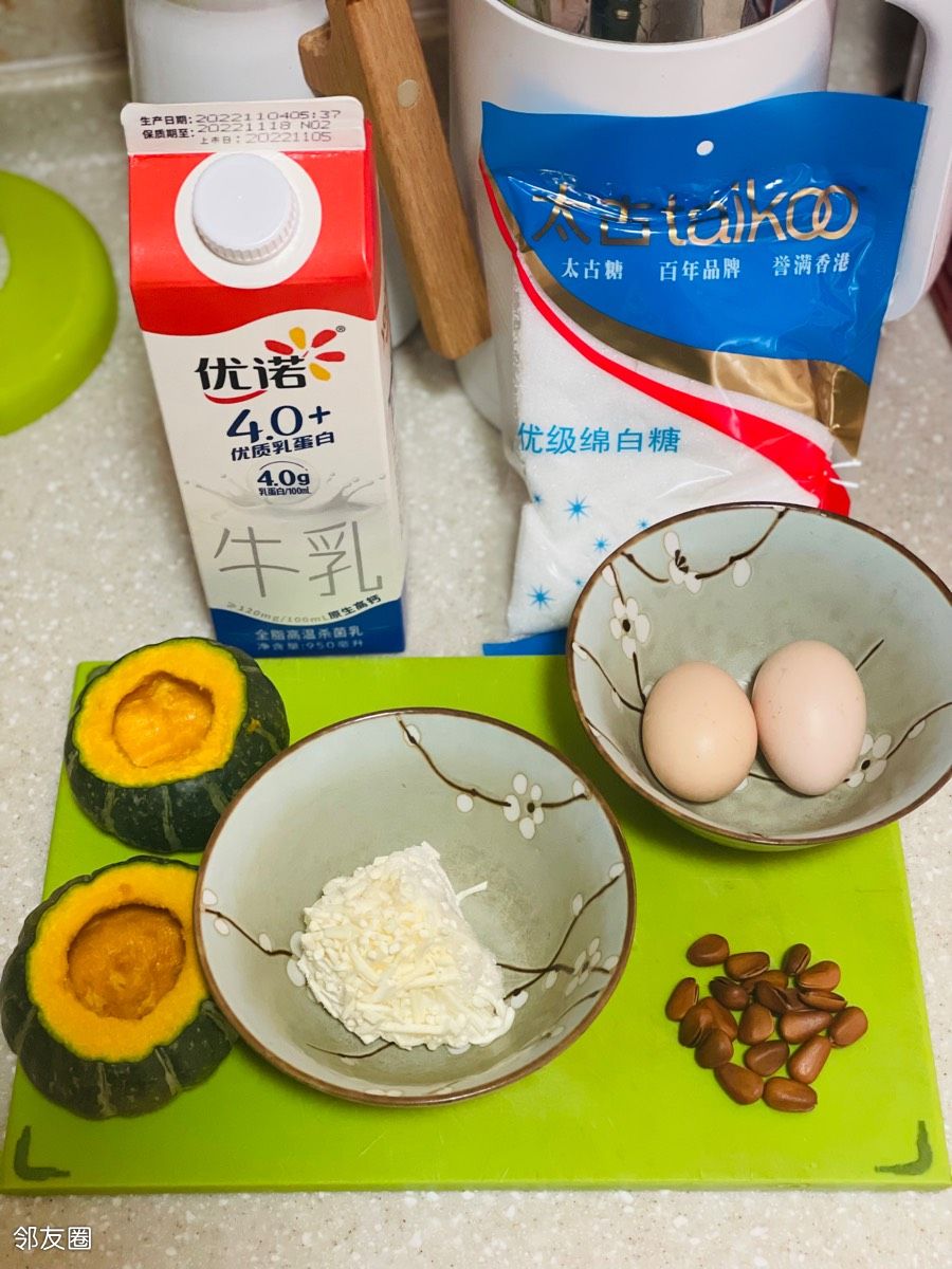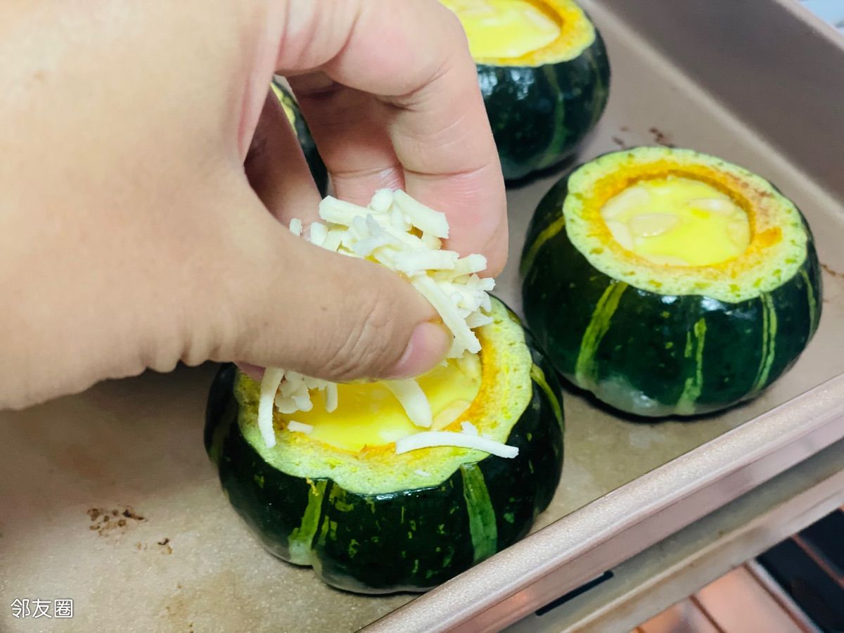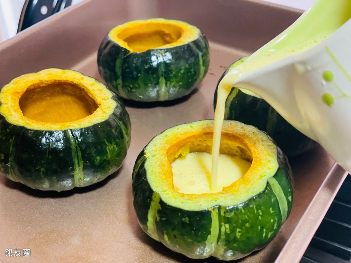 掏空南瓜,单烤南瓜180度10分钟,灌蛋奶液