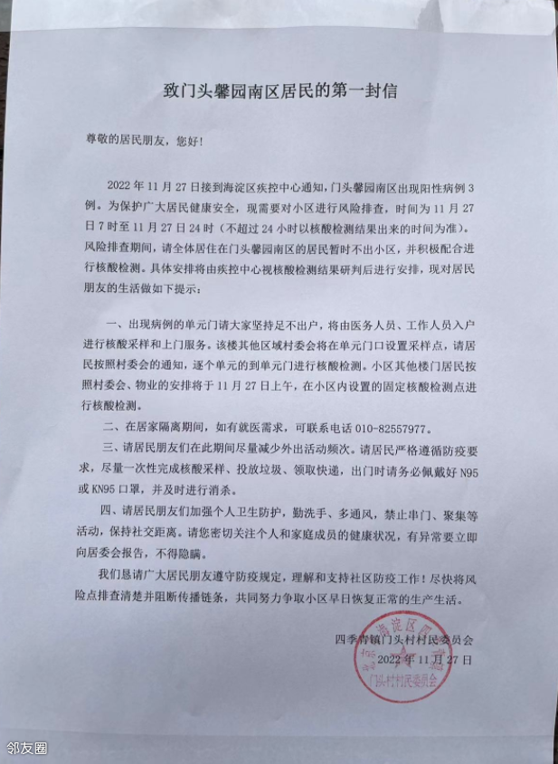 海淀门头馨园有阳性病例3例,小区风险排查。