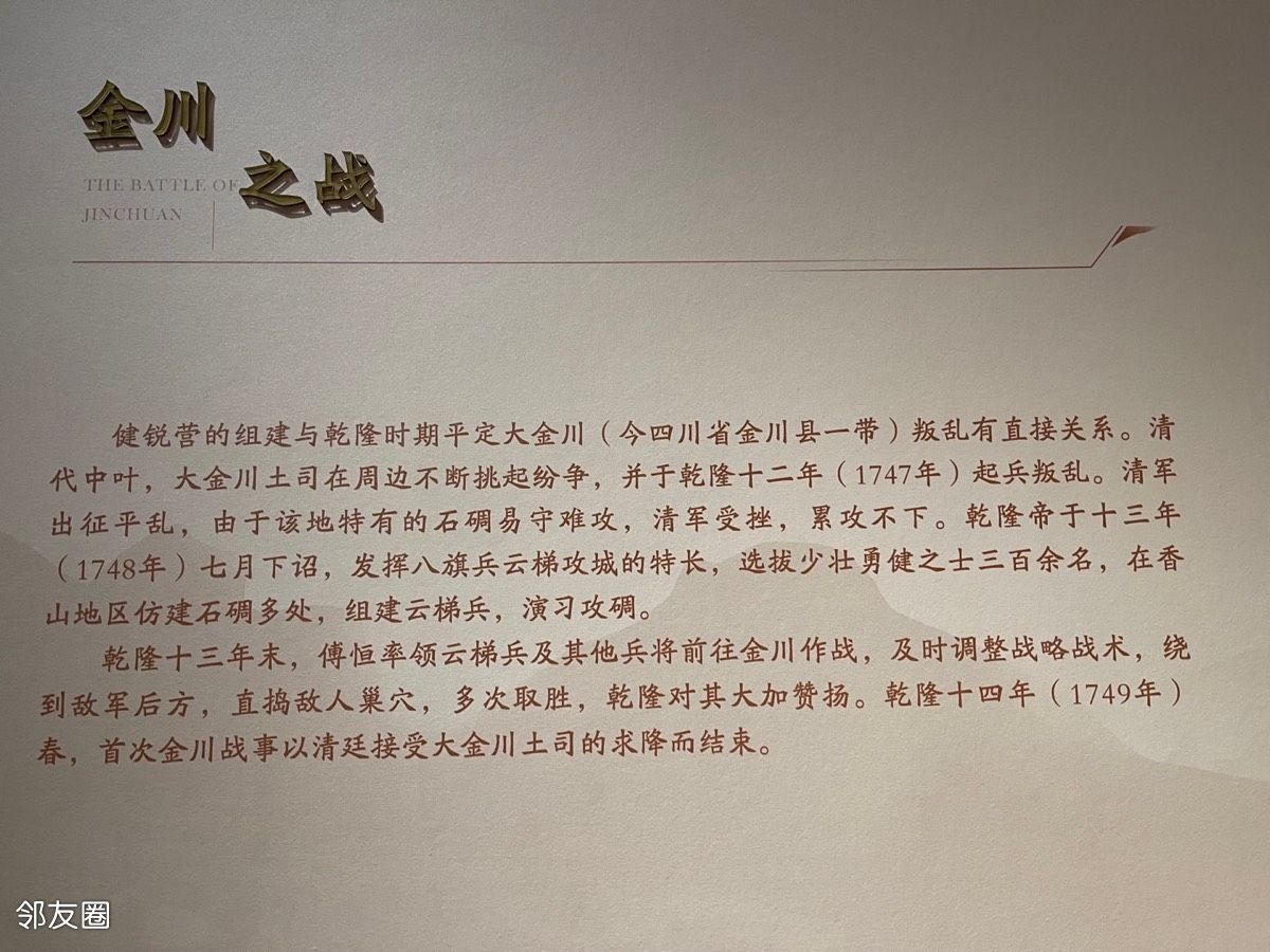 乾隆12年春,大金川(今四川省金川县)地方土司之间互相展开大规模的攻掠和械斗。由于该地特有的石碉易守难攻,清军平乱受挫累攻不下。乾隆帝于13年下诏,选拔少壮巴图鲁300余名,在香山地区仿建石碉多处,组建云梯队----就是后来的健锐营。平定大小金川后乾隆也是常来此观看健锐云梯营演练,当年演武厅除了建有团城演武厅等建筑外,在演武厅东南侧不远还建有“健铣营,八旗教场”,也称之为“放马黄城”、“跑马城”等。
