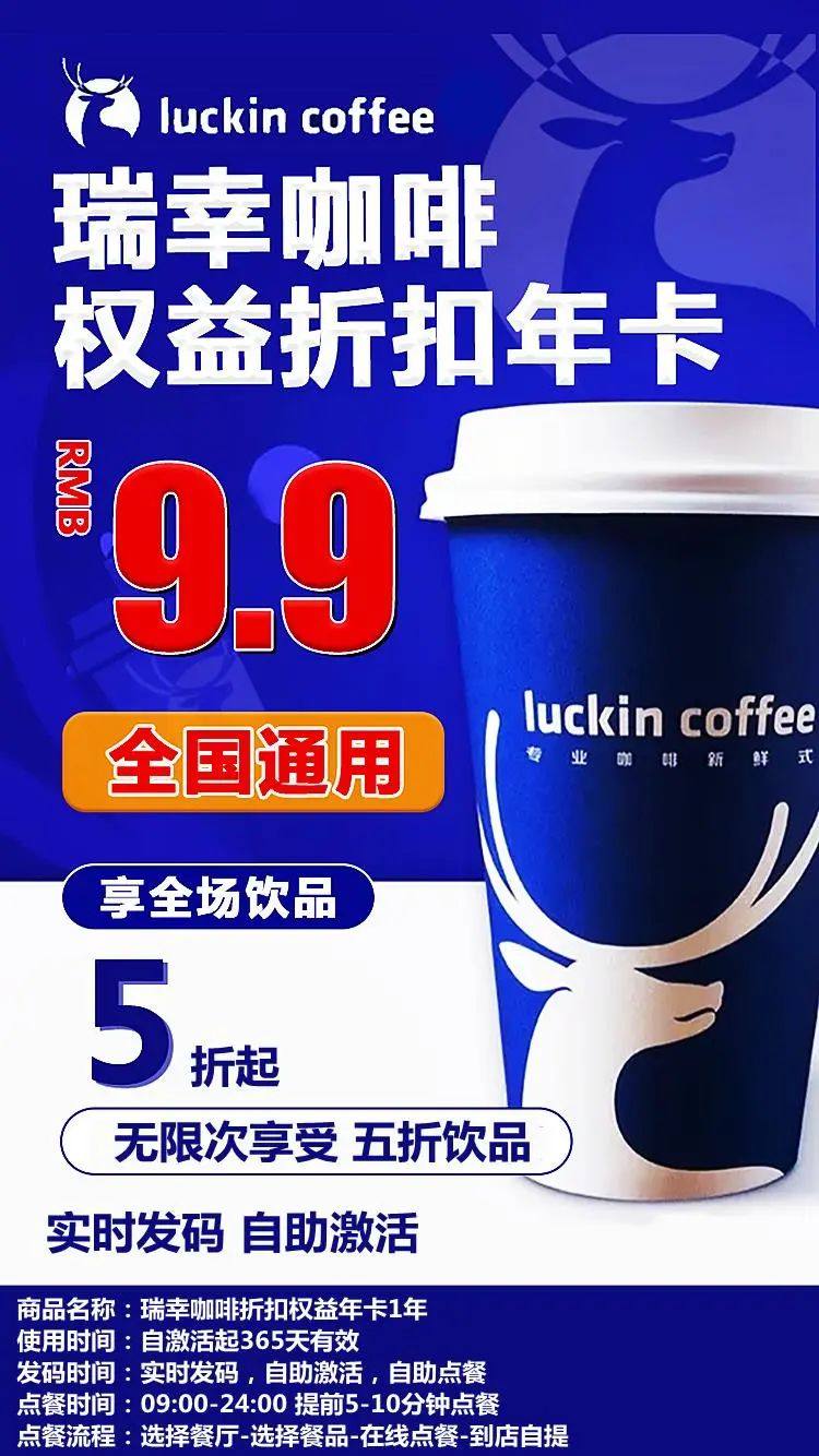 瑞幸咖啡折扣权益年卡1张:9.9元(原价199元,自激活日起一年有效)