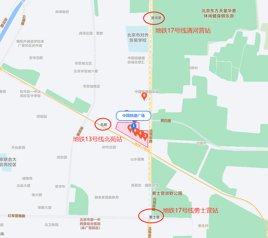来广营地区的中国铁建广场相信大家非常熟悉,这个位置在北苑东路与地铁13号线交界处北侧。从地铁13号线北苑站出站后,步行仅3分钟即可到达。同时北苑东路上还有目前在建的地铁17号线,开通运营后无论从清河营站还是从勇士营站到中国铁建广场的步行时间,也仅有几分钟。交通的便利不言而喻!