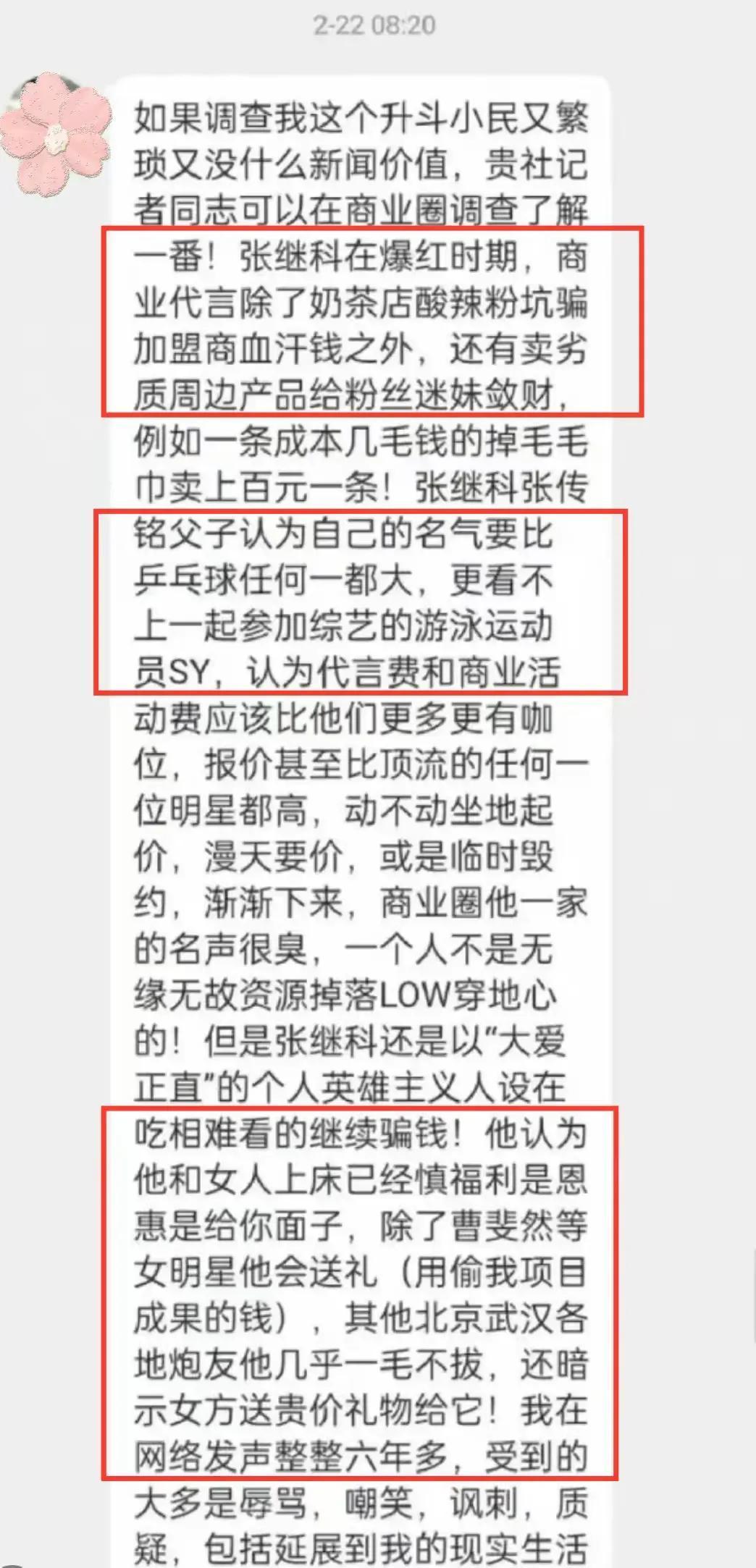 爆料一开始,就直言张继科在爆红期间,除了商业代言外,还用奶茶和酸辣粉坑加盟商的血汗钱。