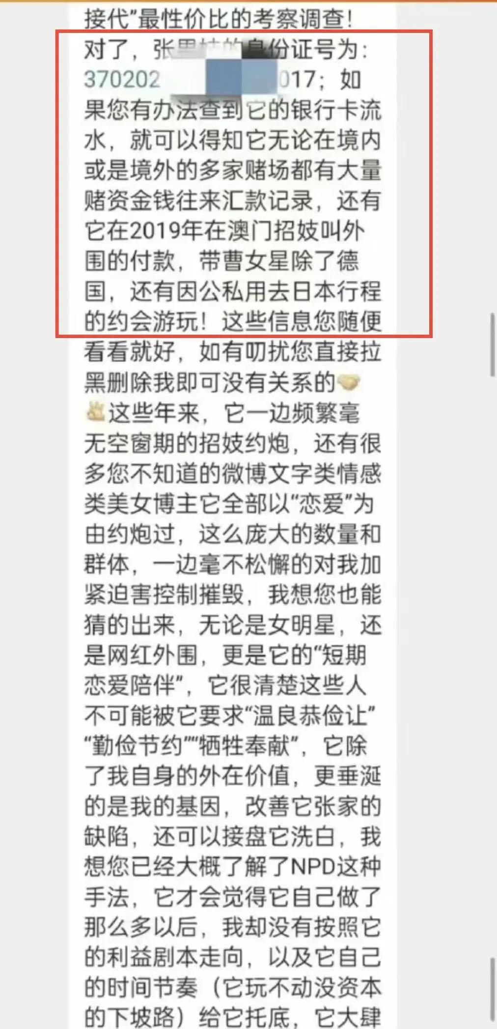 随后,爆料人还报出了张继科的身份证号码,并称如果能有办法查到它的银行卡流水,就能发现张继科在很多家赌场都有大量的资金往来。