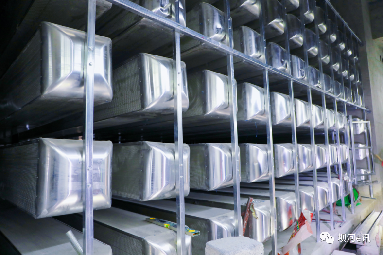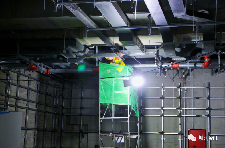 顺着梯笼往下走,几名施工工人正在进行着站厅层的建设工作,现场可以看到,综合支吊架已基本建设完成,内饰装修的标尺线在墙上清晰可见,除此以外,消音区、通风空调机房也已达到使用标准。与其他站点不同的是,北岗子站的通风空调机房在安装形式上采取了创新工艺,据12号线机电负责人刘雁春介绍,因机房内各专业管路排布相对较多,导致施工作业时管路排布或安装过程中会经常发生冲突的情况,这一直是地铁施工难点较多的地方。为了解决此问题,北岗子站在施工和质量管理方面均进行了工艺创新,通过BIM技术对机房进行整体调整,按照系统进行重新分割,优化整合了各系统分列排布,达到了美观的效果,既确保了工期,也同步解决了机房内各管路排布冲突等施工工艺问题。