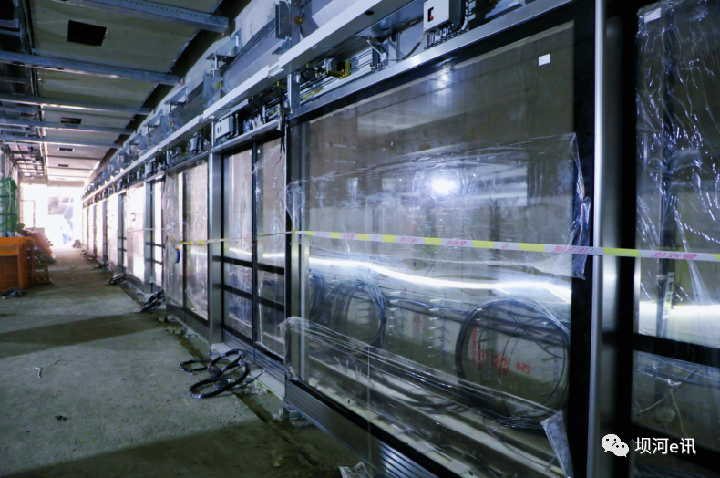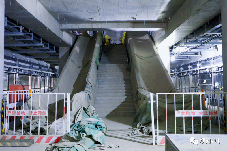 随后,跟随负责人的步伐,小编来到了位于地下15米左右的站台层,可以看到的扶梯和地铁防护门均已搭建完成,准备进行成品保护。