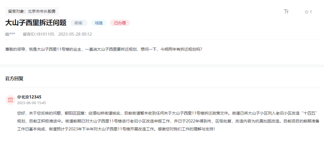 下面小编整理了朝阳群众关心的拆迁腾退旧改等问题,一起来看: