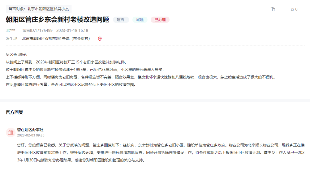 从新闻上了解到,2023年朝阳区将新开工15个老旧小区改造并加装电梯。位于朝阳区管庄乡的东会新村楼房始建于1997年,已历经25年风雨,小区里的居民老年人居多,上下楼都特别不方便,同时楼房为老旧房屋,各种设施皆不完善,隔音效果差,楼房北邻京通快速路和八通线地铁,噪音也极大,综上给生活造成了极大的不便利。在此恳请区政府进行考量,是否可以将此小区尽快的纳入老旧小区的改造范围。您好,您的留言已收悉。关于您反映的问题,管庄乡回复如下:经核实,东会新村为管庄乡老旧小区,建设单位为管庄乡政府。物业公司为北京顺长物业公司,现我乡正在推进老旧小区改造前期准备工作,提升周边环境,安排进行居民改造意愿调查,同步开展拆除违法建设工作,待条件成熟之后上报老
