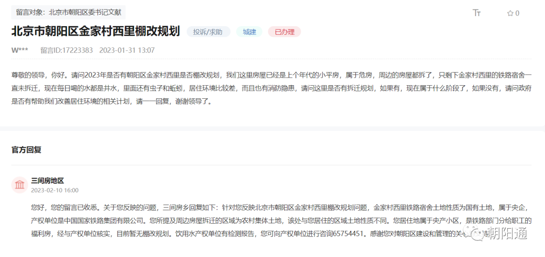 尊敬的领导,你好。请问2023年是否有朝阳区金家村西里是否棚改规划,我们这里房屋已经是上个年代的小平房,属于危房,周边的房屋都拆了,只剩下金家村西里的铁路宿舍一直未拆迁,现在每日喝的水都是井水,里面还有虫子和蚯蚓,居住环境比较差,而且也有消防隐患,请问这里是否有拆迁规划,如果有,现在属于什么阶段了,如果没有,请问政府是否有帮助我们改善居住环境的相关计划,请一一回复,谢谢领导了。