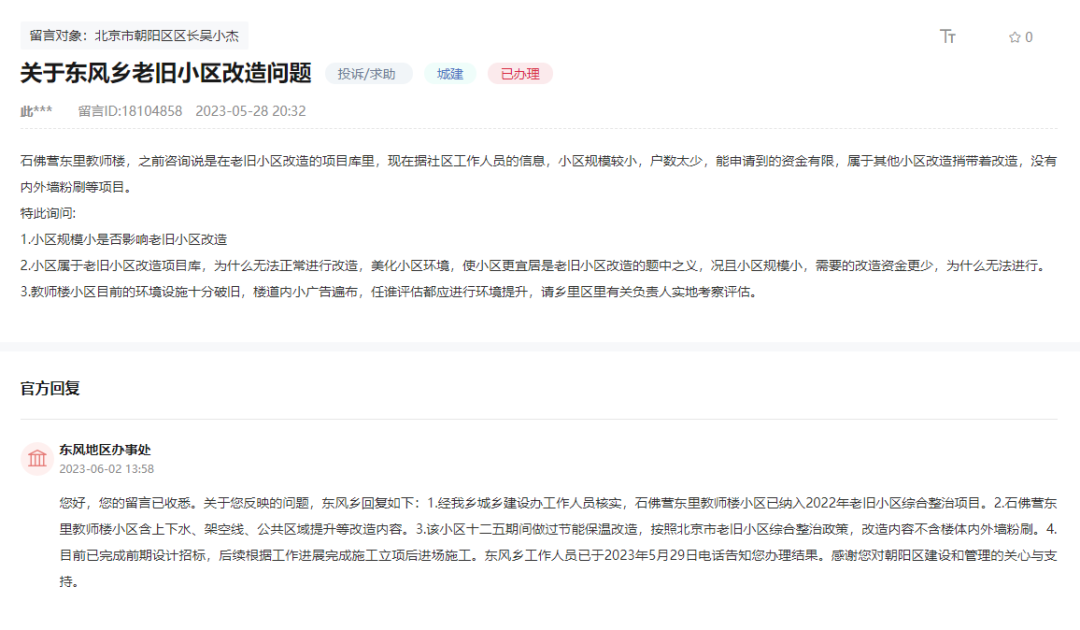 您好,您的留言已收悉。关于您反映的问题,东风乡回复如下:1.经我乡城乡建设办工作人员核实,石佛营东里教师楼小区已纳入2022年老旧小区综合整治项目。2.石佛营东里教师楼小区含上下水、架空线、公共区域提升等改造内容。3.该小区十二五期间做过节能保温改造,按照北京市老旧小区综合整治政策,改造内容不含楼体内外墙粉刷。4.目前已完成前期设计招标,后续根据工作进展完成施工立项后进场施工。东风乡工作人员已于2023年5月29日电话告知您办理结果。感谢您对朝阳区建设和管理的关心与支持。