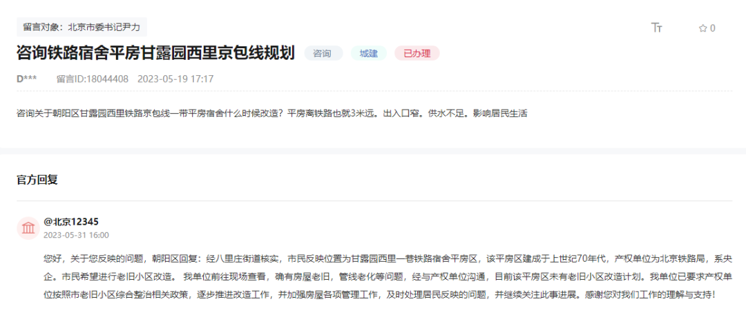咨询关于朝阳区甘露园西里铁路京包线一带平房宿舍什么时候改造?平房离铁路也就3米远。出入口窄。供水不足。影响居民生活
