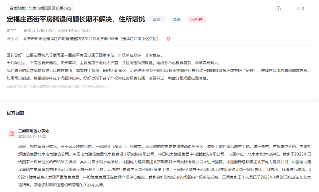 您好,您的留言已收悉。关于您反映的问题,三间房乡回复如下:经核实,您反映的位置是定福庄西街平房区,该处土地性质为国有土地,属于央产,产权单位分别:中国能源建设集团北京电力建设公司、中国电力建设集团北京勘察设计研究院有限公司、中国电力建设集团中电建建筑有限公司、市属单位:北京水利水电学校。我乡于2022年已给四家产权单位发函告知居民诉求,其中北京水利水电学校,中国电力建设集团北京勘察设计研究院有限公司未进行回复,中国能源建设集团北京电力建设公司、中国电力建设集团中电建建筑有限公司回函表示由于资金问题,无法进行定福庄西街平房区腾退工作。三间房乡政府于2020-2022年出资对西街平房区排水、自来水、环境进行改造。2022年建房普查未发现严重隐患房屋,一般隐患房屋正在协调产权单位整改。我乡会针对您反映的问题向产权单位反映。感谢您对朝阳区建设和管理的关心与支持。