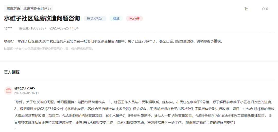 领导好,水碓子社区在2020年就已经列入到北京第一批老旧小区综合整治项目中,房子已经70多年了,甚至已经开始发生偏移,请领导给予重视。