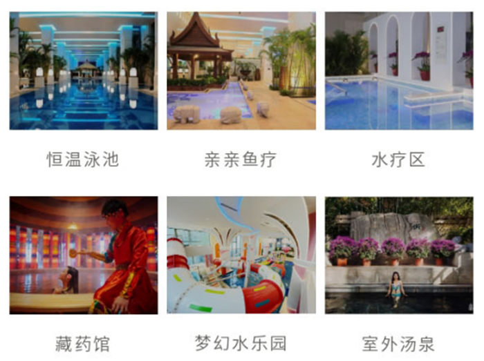【室内温泉】:温泉水疗区、温泉嬉水乐园、藏药馆、无边际泳池、暴汗池、薄荷池、益母草池、亲亲鱼池、激灵池、红酒池、玫瑰池、水果柚子池