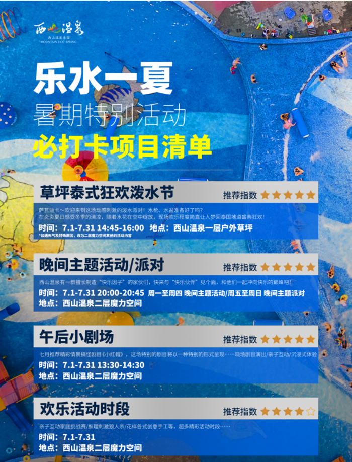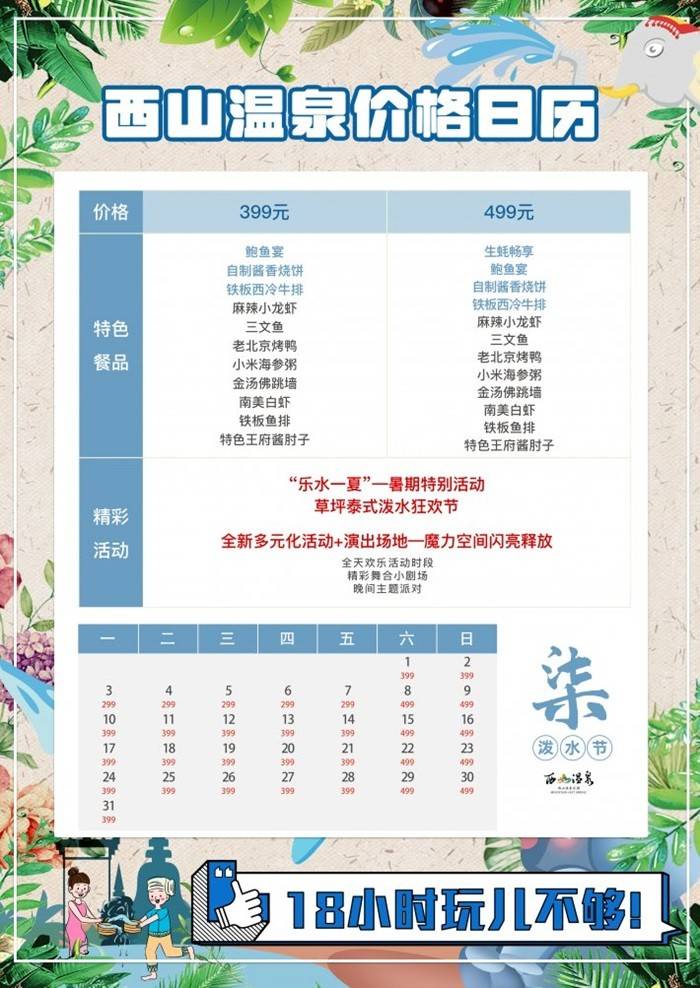 2.西山温泉门票超时付费规则:按照购买产品游玩时间计算,离店若产生超时,需按当日门市价加收温泉门票1张/人,请注意游玩后离店时间,避免超时。