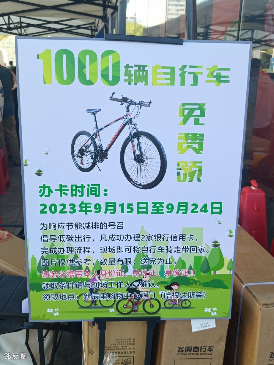溜达到了新辰里购物中心也让我看到了免费领取山地车的一群感兴趣的人们。我就不去凑热闹了。看到上面说办卡时间2023年9月15日至9月24日,为响应节能减排的号召倡导低碳出行,凡成功办理2家银行信用卡,完成办理流程,现场即可将自行车骑走带回家。图片仅供参考,数量有限,送完为止。请务必携带本人身份证、身份证、身份证!!!