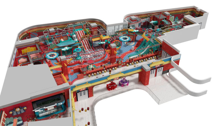 这里的设计灵感源于中华五千年传统文化,乐园整体设计参考中国古代建筑风格,亭台楼阁、飞檐翘角,仿古韵味浓厚。祥云纹、龙凤图案等传统元素的应用,使乐园仿佛成为一座穿越时光的宝库,彰显出中华文化的魅力。