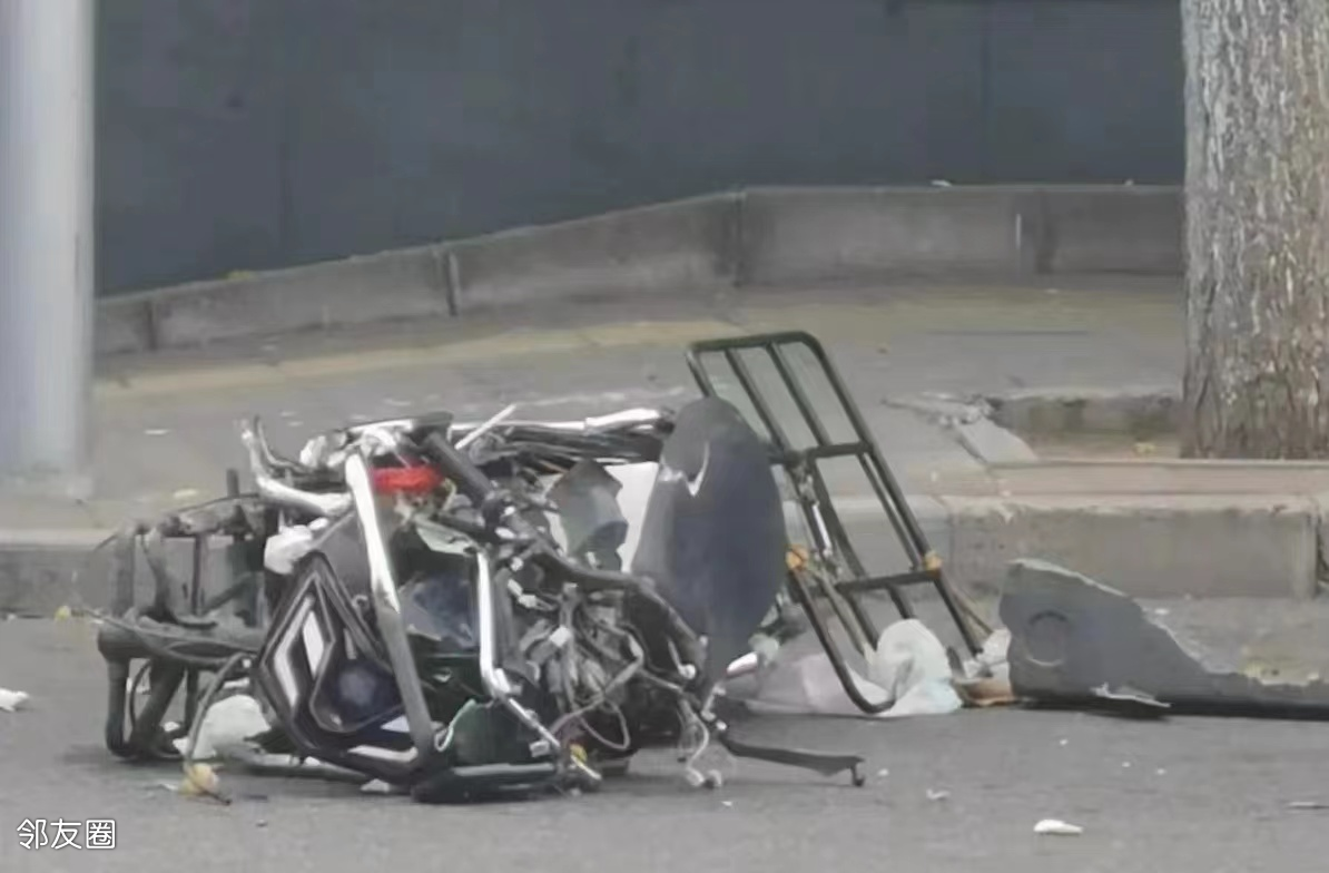 可以看到,现场一片凌乱,送餐电动车已经撞成一团铁,后面装快递的箱子都撞没了,只剩下一个铁架子。