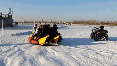 香蕉船是风靡于全球的雪地娱乐项目。可爱的香蕉型气垫船俨然就是一根大香蕉,在白雪的世界中,端坐在雪地香蕉船上,随着马达的轰鸣声,香蕉船如脱兔般驰骋在皑皑的白雪之中