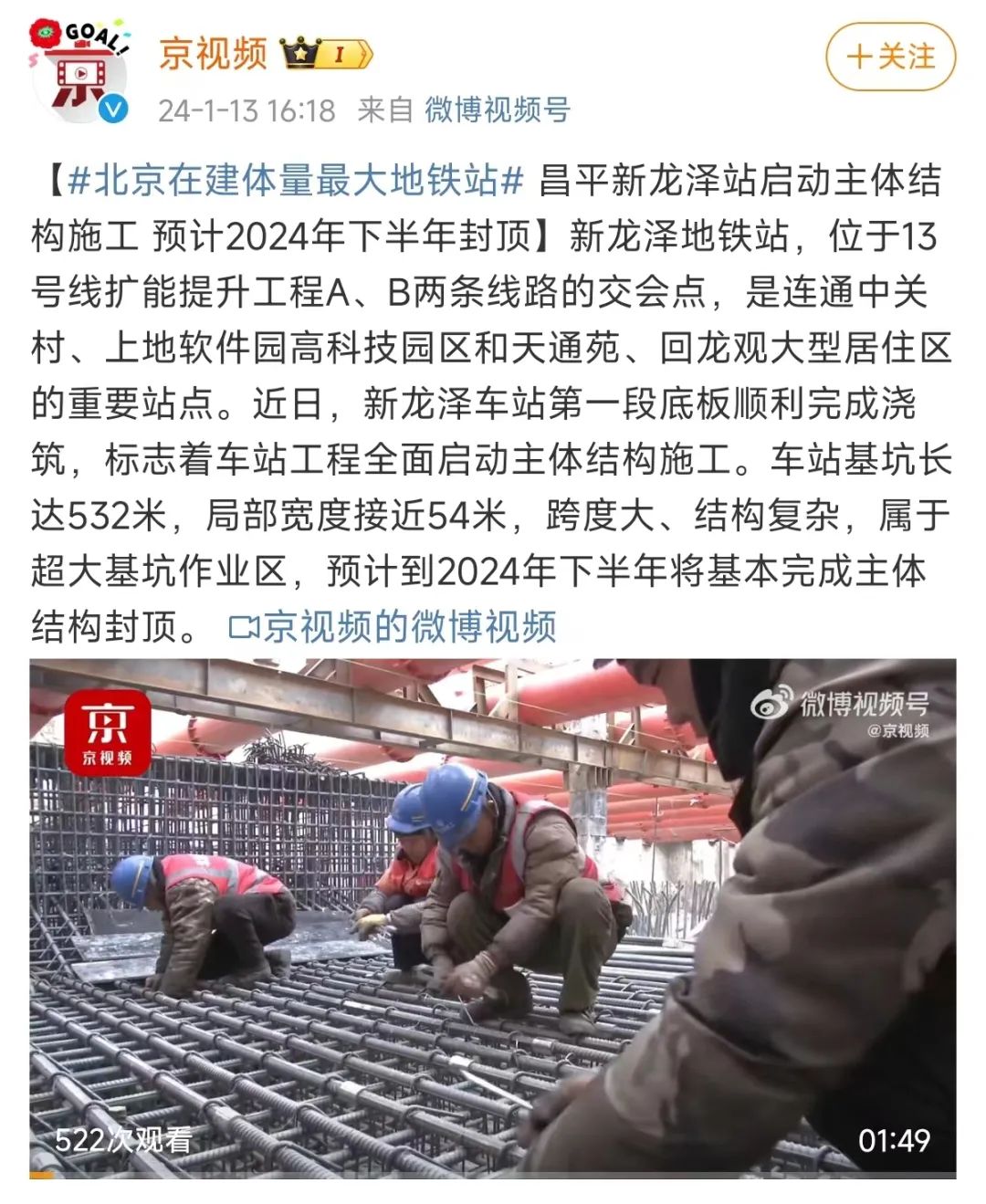 本月@京视频报道:地铁13号线新龙泽站启动主体结构施工,预计2024年下半年封顶。详情如下——