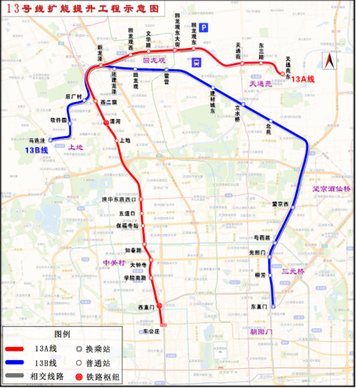 地铁13号线扩能提升工程是在老13号线的基础上进行扩能改造,线路将被拆分成两条L型路线,即13A、13B两条线路。