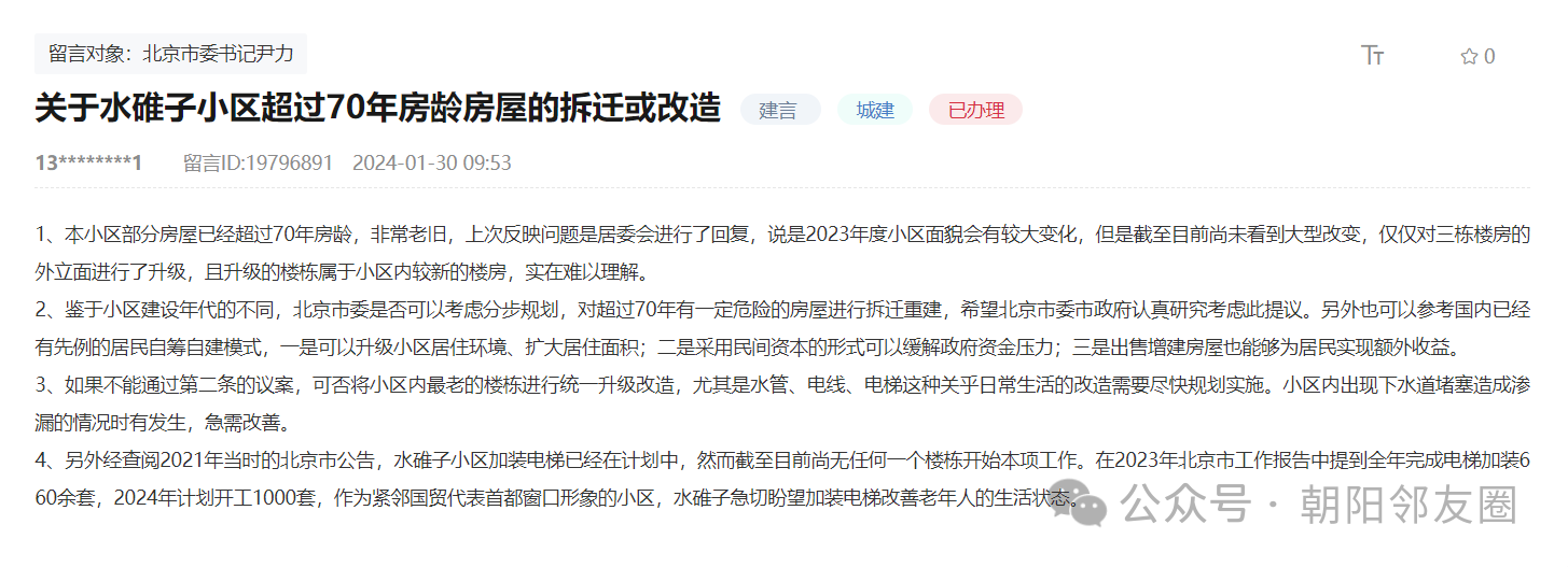 4、另外经查阅2021年当时的北京市公告,水碓子小区加装电梯已经在计划中,然而截至目前尚无任何一个楼栋开始本项工作。在2023年北京市工作报告中提到全年完成电梯加装660余套,2024年计划开工1000套,作为紧邻国贸代表首都窗口形象的小区,水碓子急切盼望加装电梯改善老年人的生活状态。