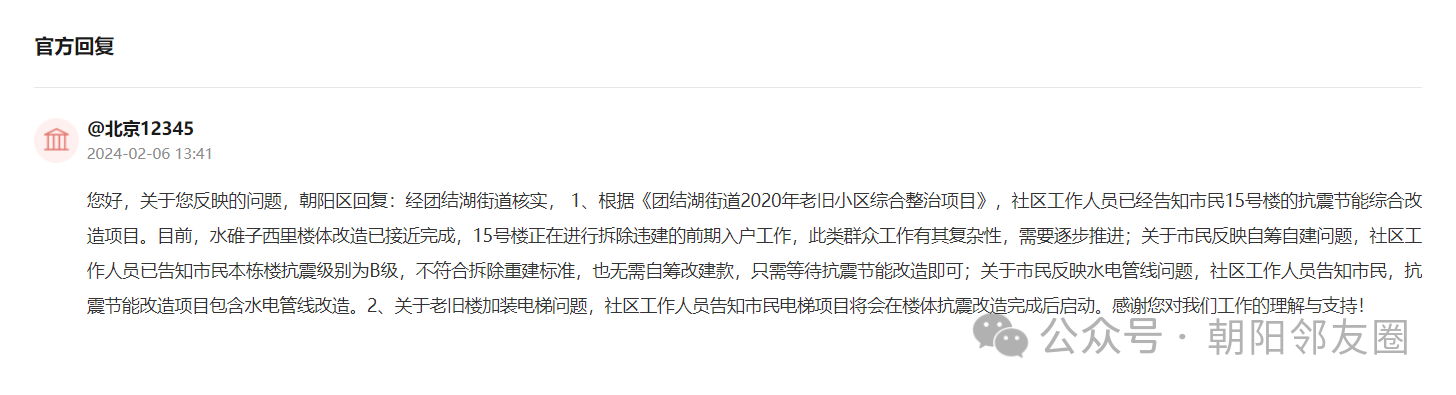 您好,关于您反映的问题,朝阳区回复:经团结湖街道核实, 1、根据《团结湖街道2020年老旧小区综合整治项目》,社区工作人员已经告知市民15号楼的抗震节能综合改造项目。目前,水碓子西里楼体改造已接近完成,15号楼正在进行拆除违建的前期入户工作,此类群众工作有其复杂性,需要逐步推进;关于市民反映自筹自建问题,社区工作人员已告知市民本栋楼抗震级别为B级,不符合拆除重建标准,也无需自筹改建款,只需等待抗震节能改造即可;关于市民反映水电管线问题,社区工作人员告知市民,抗震节能改造项目包含水电管线改造。2、关于老旧楼加装电梯问题,社区工作人员告知市民电梯项目将会在楼体抗震改造完成后启动。感谢您对我们工作的理解与支持!
