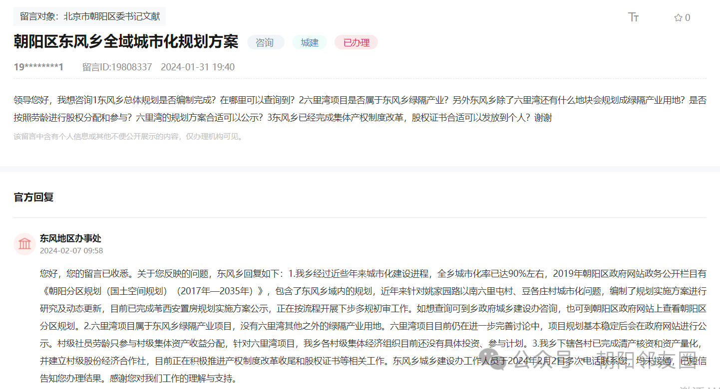 您好,您的留言已收悉。关于您反映的问题,东风乡回复如下:1.我乡经过近些年来城市化建设进程,全乡城市化率已达90%左右,2019年朝阳区政府网站政务公开栏目有《朝阳分区规划(国土空间规划)(2017年—2035年)》,包含了东风乡域内的规划,近年来针对姚家园路以南六里屯村、豆各庄村城市化问题,编制了规划实施方案进行研究及动态更新,目前已完成苇西安置房规划实施方案公示,正在按流程开展下步多规初审工作。如想查询可到乡政府城乡建设办咨询,也可到朝阳区政府网站上查看朝阳区分区规划。2.六里湾项目属于东风乡绿隔产业项目,没有六里湾其他之外的绿隔产业用地。六里湾项目目前仍在进一步完善讨论中,项目规划基本稳定后会在政府网站进行公示。村级社员劳龄只参与村级集体资产收益分配,针对六里湾项目,我乡各村级集体经济组织目前还没有具体投资、参与计划。3.我乡下辖各村已完成清产核资和资产量化,并建立村级股份经济合作社,目前正在积极推进产权制度改革收尾和股权证书等相关工作。东风乡城乡建设办工作人员于2024年2月2日多次电话联系您,均未接通,已短信告知您办理结果。感谢您对我们工作的理解与支持。