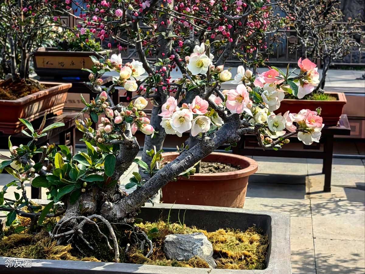 数株大规格杏树共同盛放,形成绚丽的鲜花走廊,花苞时艳红,盛放后白里透粉,美艳动人。