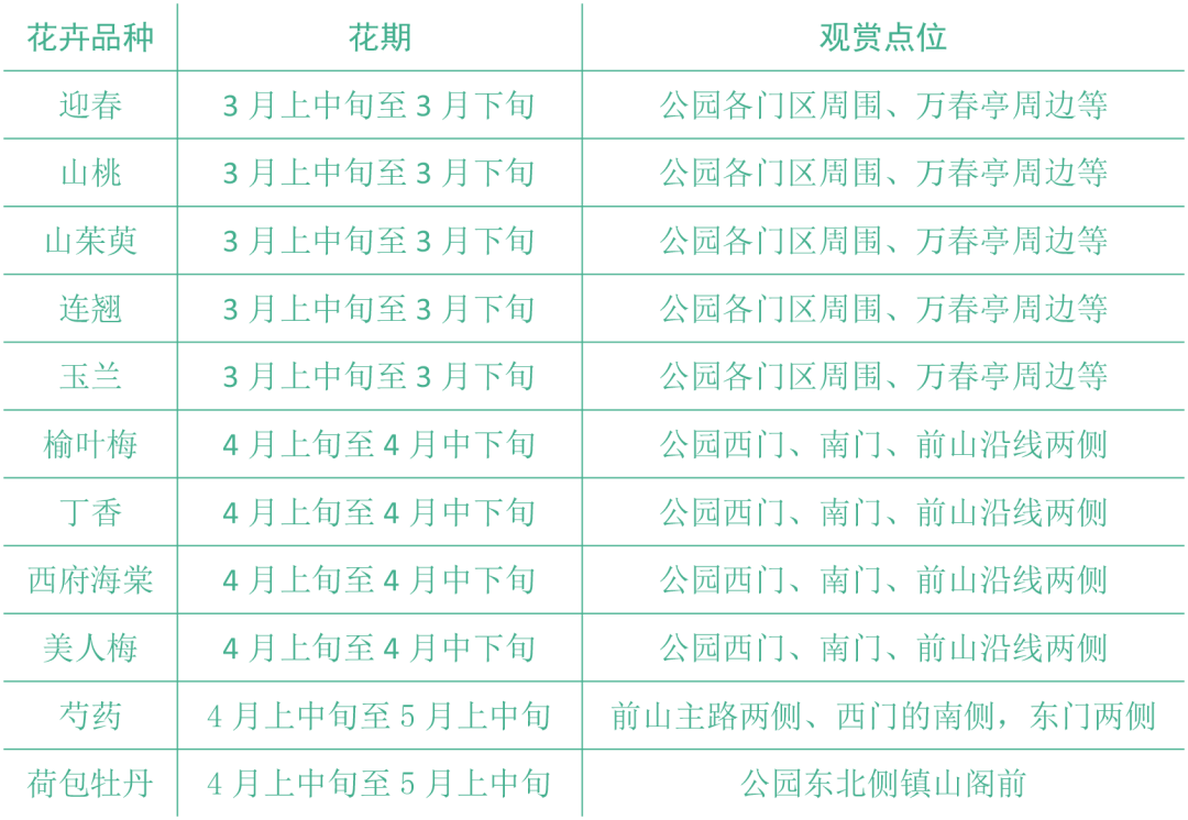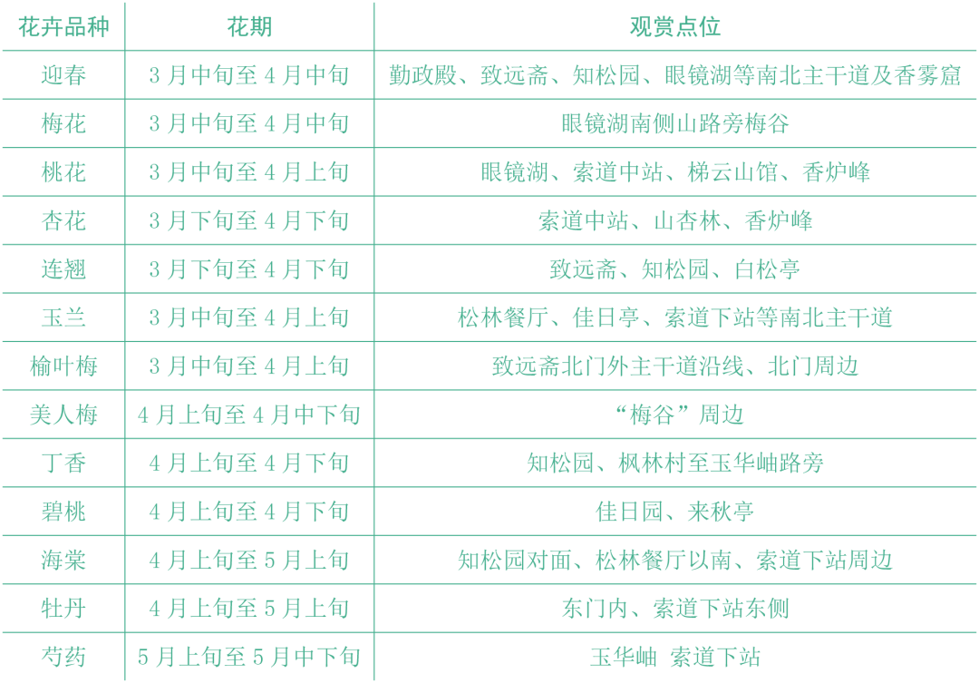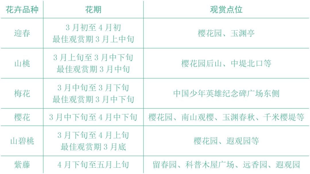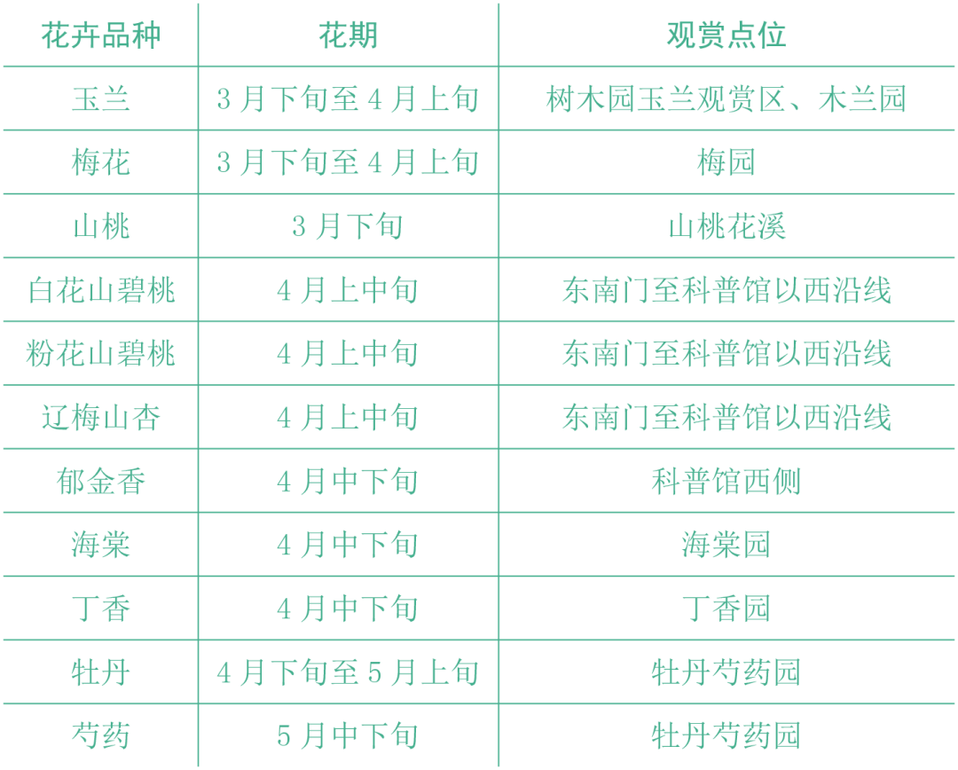 观赏点位:山桃花溪、梅园、木兰园、科普馆西侧、海棠园、丁香园等