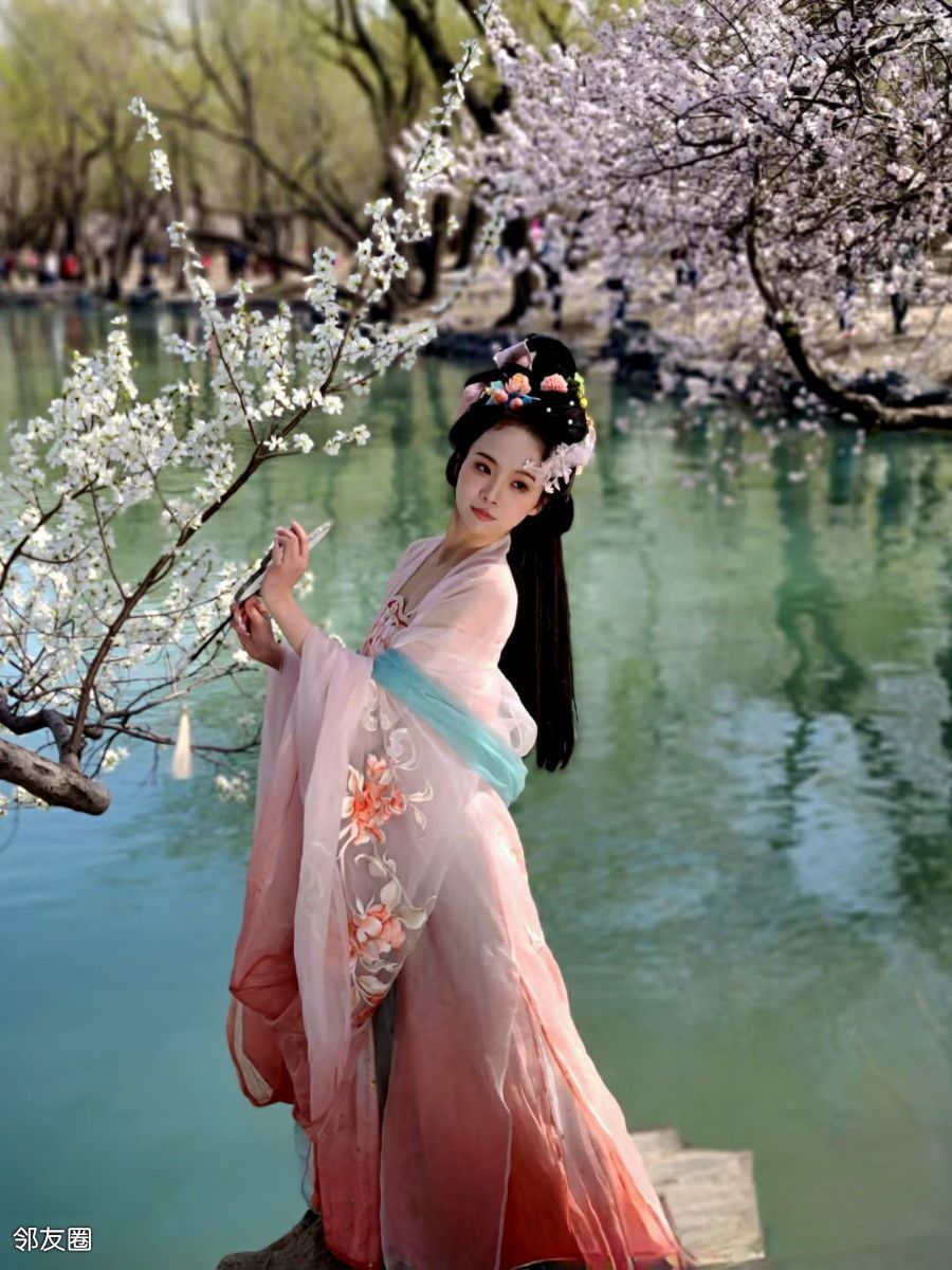 西堤山桃花沿着西堤绵延探入昆明湖,深粉、浅粉、桃粉等花枝与湖光山色、塔影桥韵交织。身临其中,在花枝间远眺佛香阁和十七孔桥,花影在身边交错,身处春意盎然的美景之中,人在花中游,人在画中游。每年春天,都有不少汉服爱好者身着汉服在西堤拍照,宛如穿越了时空!