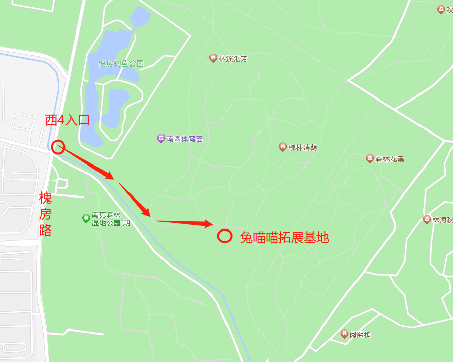 自驾:导航“北京市丰台区南苑湿地公园西4门兔喵喵拓展基地”。