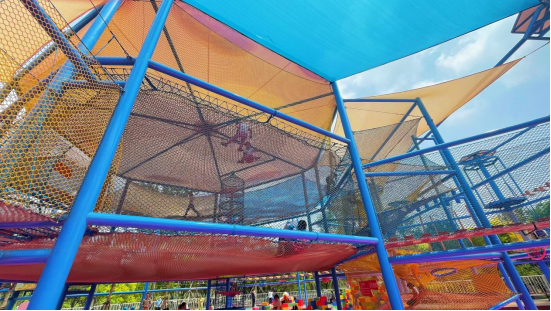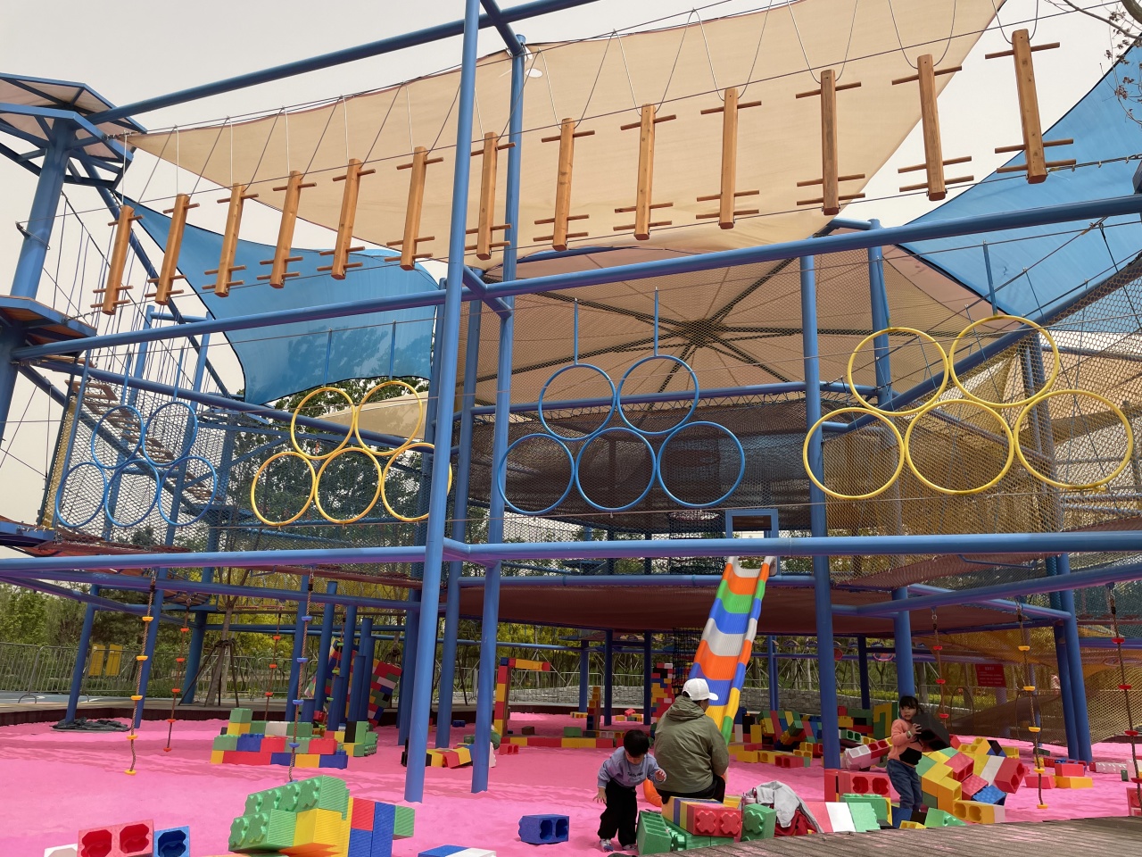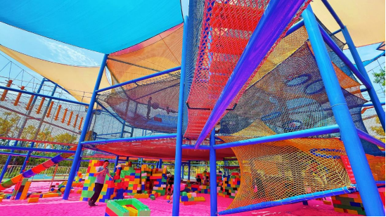 三层游玩空间,高度9米,粉红沙池、巨型积木可供儿童自由玩耍,二层三层绳网空间穿行探索,同时还包含直行串塔、之形叠网、滑梯、秋千、趣味拓展等项目……