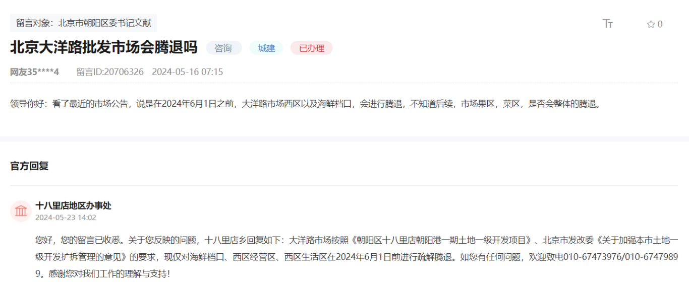 您好,您的留言已收悉。关于您反映的问题,十八里店乡回复如下:大洋路市场按照《朝阳区十八里店朝阳港一期土地一级开发项目》、北京市发改委《关于加强本市土地一级开发扩拆管理的意见》的要求,现仅对海鲜档口、西区经营区、西区生活区在2024年6月1日前进行疏解腾退。如您有任何问题,欢迎致电010-67473976/010-67479899。感谢您对我们工作的理解与支持!