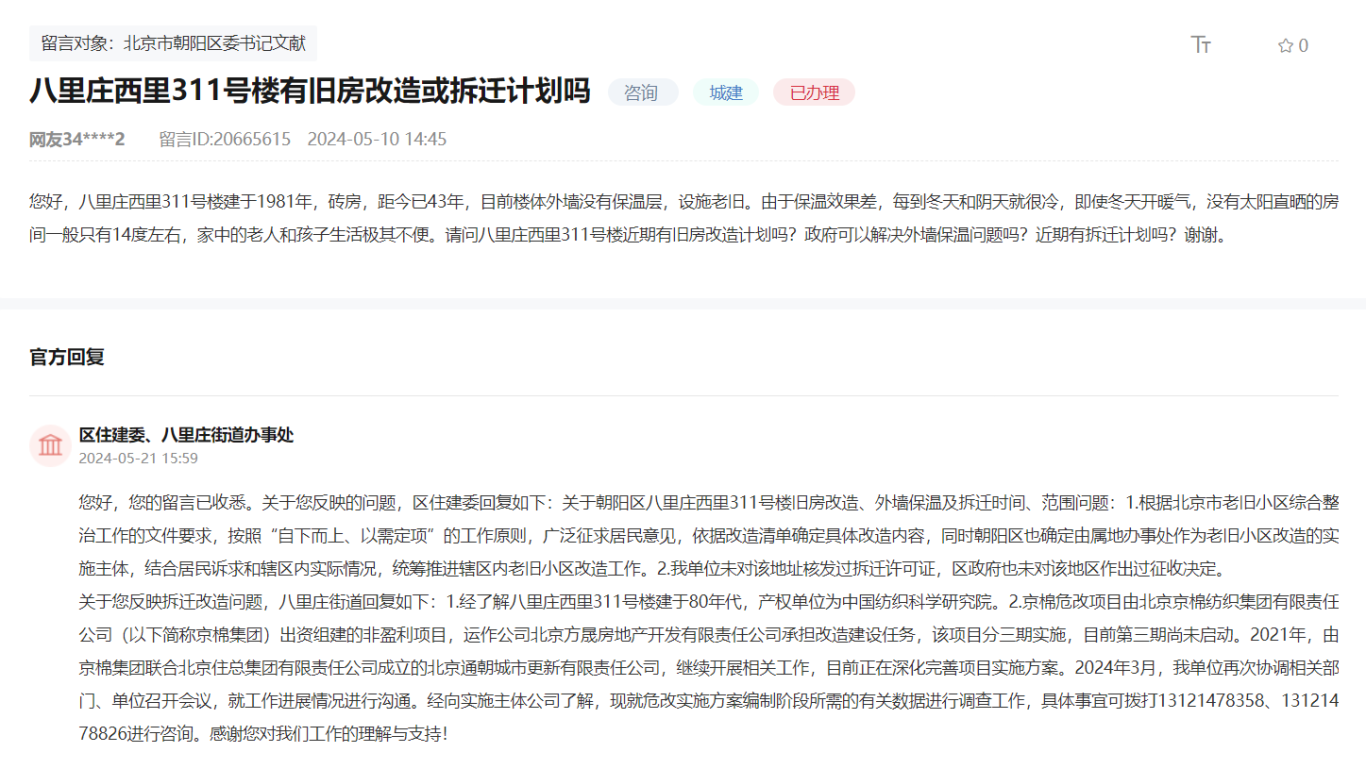 关于您反映拆迁改造问题,八里庄街道回复如下:1.经了解八里庄西里311号楼建于80年代,产权单位为中国纺织科学研究院。2.京棉危改项目由北京京棉纺织集团有限责任公司(以下简称京棉集团)出资组建的非盈利项目,运作公司北京方晟房地产开发有限责任公司承担改造建设任务,该项目分三期实施,目前第三期尚未启动。2021年,由京棉集团联合北京住总集团有限责任公司成立的北京通朝城市更新有限责任公司,继续开展相关工作,目前正在深化完善项目实施方案。2024年3月,我单位再次协调相关部门、单位召开会议,就工作进展情况进行沟通。经向实施主体公司了解,现就危改实施方案编制阶段所需的有关数据进行调查工作,具体事宜可拨打13121478358、13121478826进行咨询。感谢您对我们工作的理解与支持!