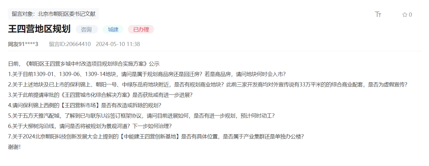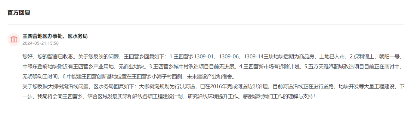 您好,您的留言已收悉。关于您反映的问题,王四营乡回复如下:1.王四营乡1309-01、1309-06、1309-14三块地块后期为商品房,土地已入市。2.保利锦上、朝阳一号、中绿东岳府地块附近有王四营乡产业用地,无商业地块。3.王四营乡城中村改造项目目前无进展。4.王四营新市场有拆除计划。5.五方天雅汽配城改造项目目前正在商讨中,无明确动工时间。6.中能建王四营创新基地位置在王四营乡小海子村西侧,未来建设产业和宿舍。