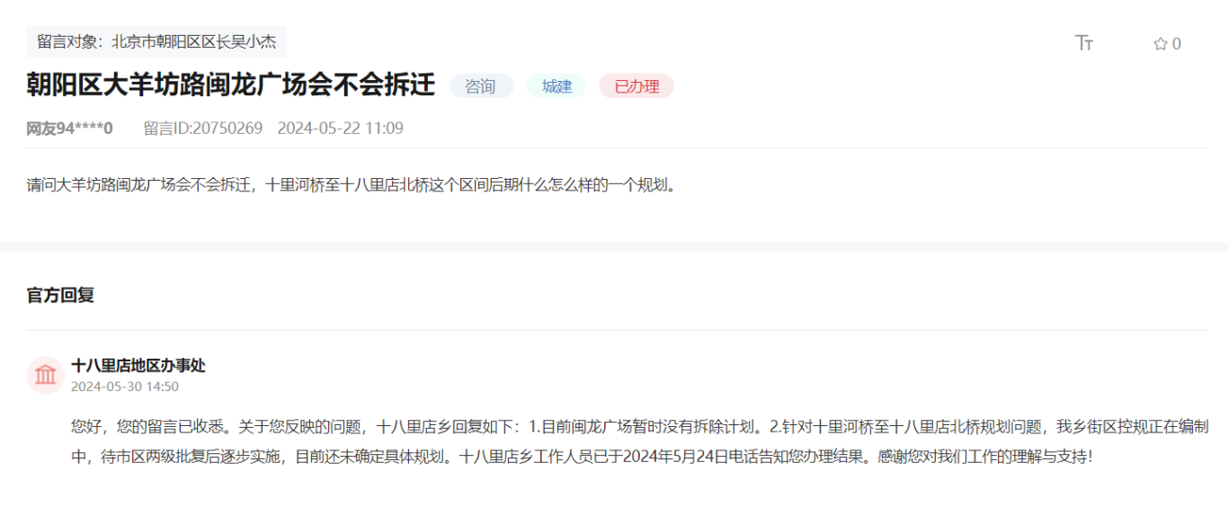 朝阳这些地方拆迁腾退的消息,官方回复了!涉及甜水园、大羊坊、八里庄等