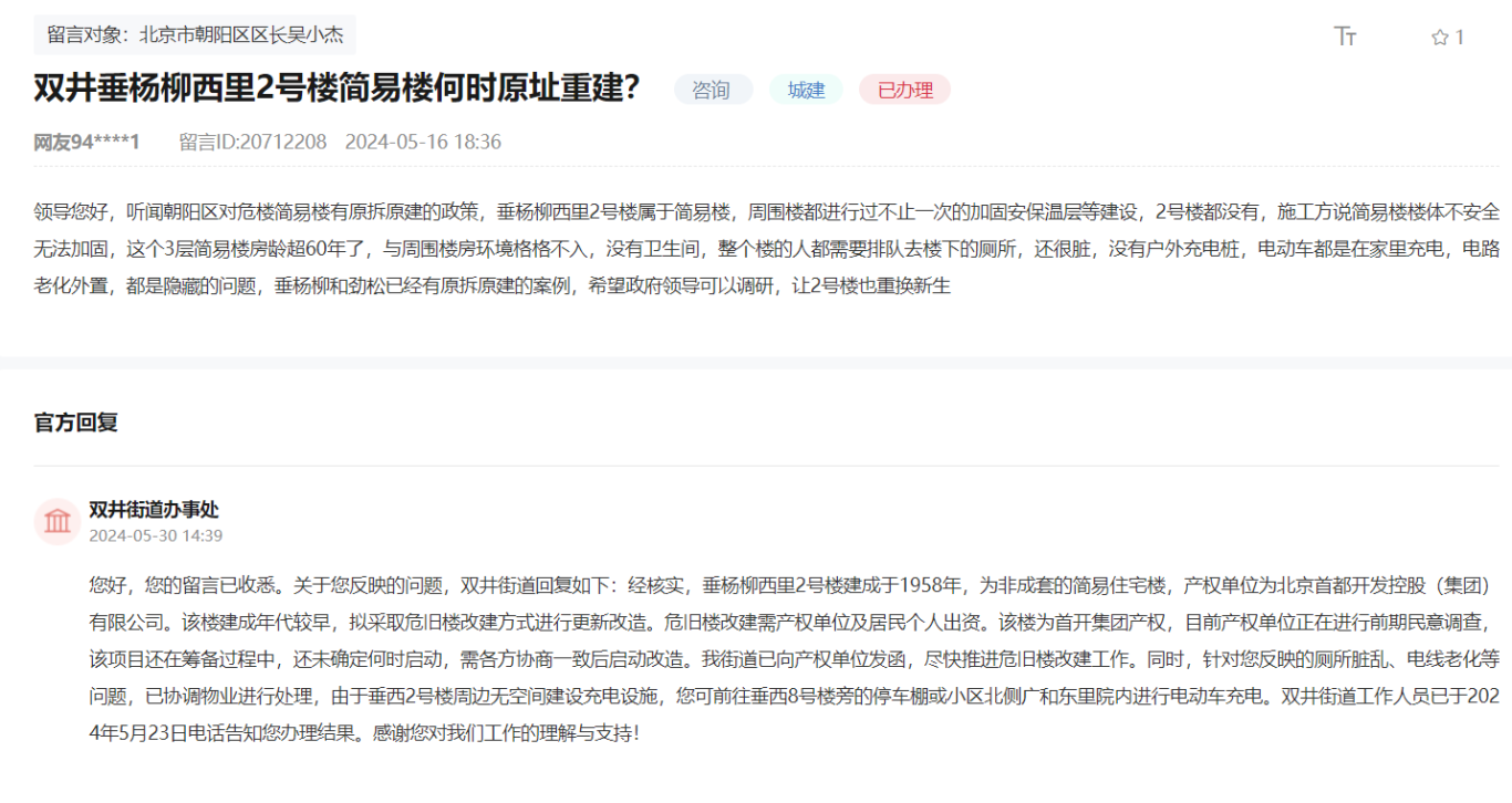 LD您好,听闻朝阳区对危楼简易楼有原拆原建的政策,垂杨柳西里2号楼属于简易楼,周围楼都进行过不止一次的加固安保温层等建设,2号楼都没有,施工方说简易楼楼体不安全无法加固,这个3层简易楼房龄超60年了,与周围楼房环境格格不入,没有卫生间,整个楼的人都需要排队去楼下的厕所,还很脏,没有户外充电桩,电动车都是在家里充电,电路老化外置,都是隐藏的问题,垂杨柳和劲松已经有原拆原建的案例,希望政府LD可以调研,让2号楼也重换新生
