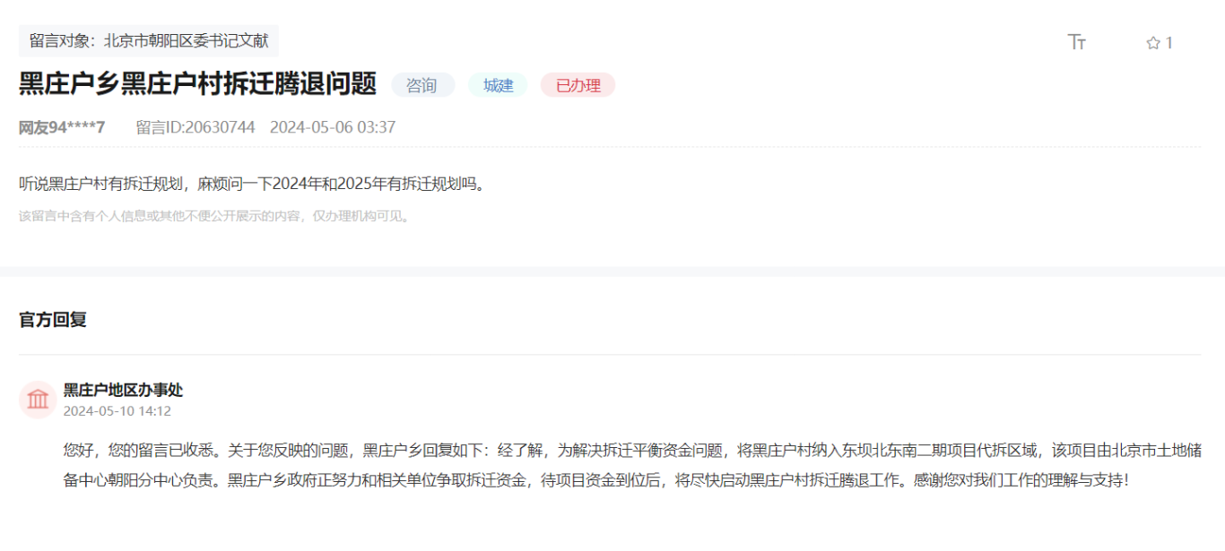 您好,您的留言已收悉。关于您反映的问题,黑庄户乡回复如下:经了解,为解决拆迁平衡资金问题,将黑庄户村纳入东坝北东南二期项目代拆区域,该项目由北京市土地储备中心朝阳分中心负责。黑庄户乡政府正努力和相关单位争取拆迁资金,待项目资金到位后,将尽快启动黑庄户村拆迁腾退工作。感谢您对我们工作的理解与支持!
