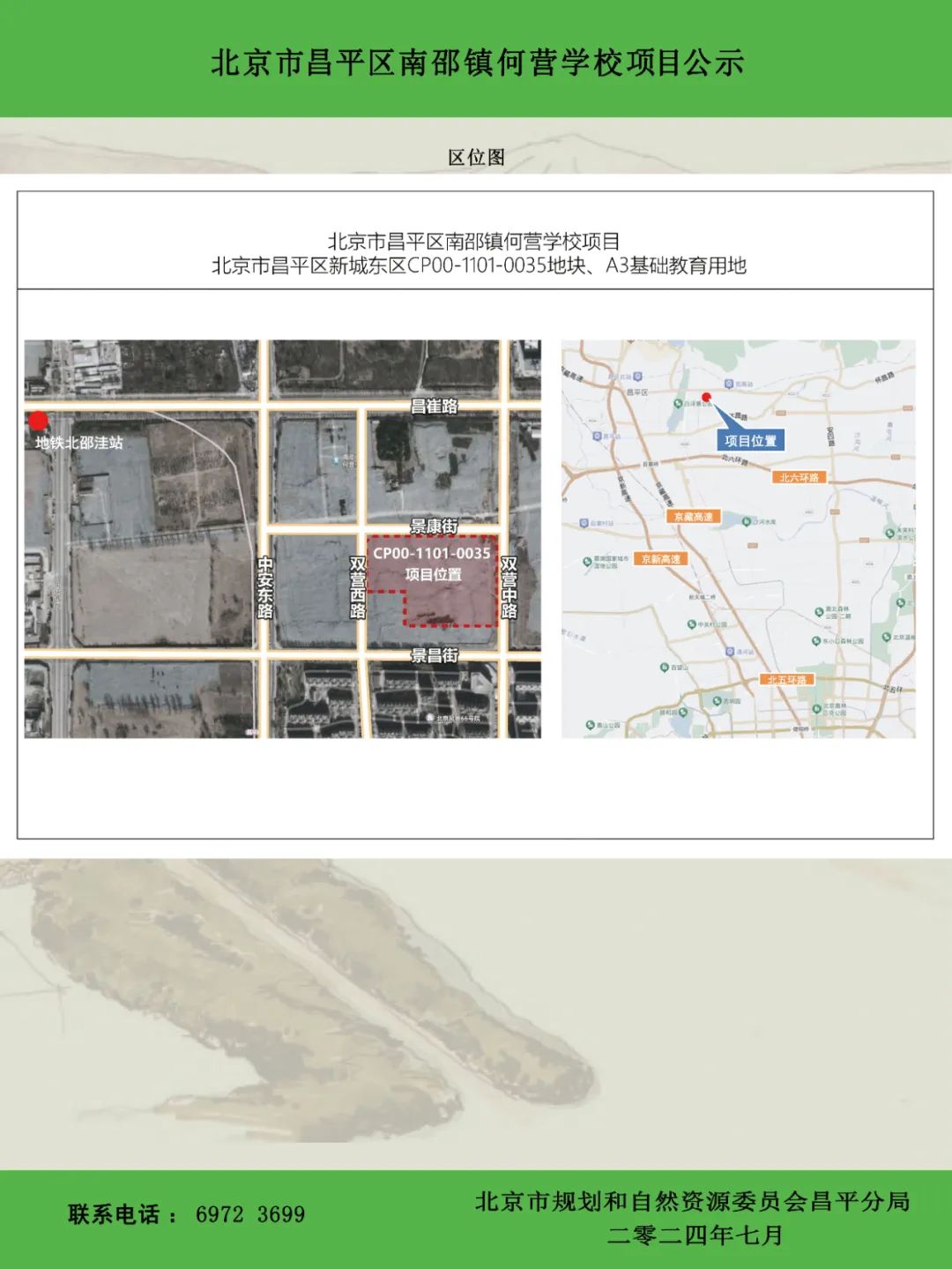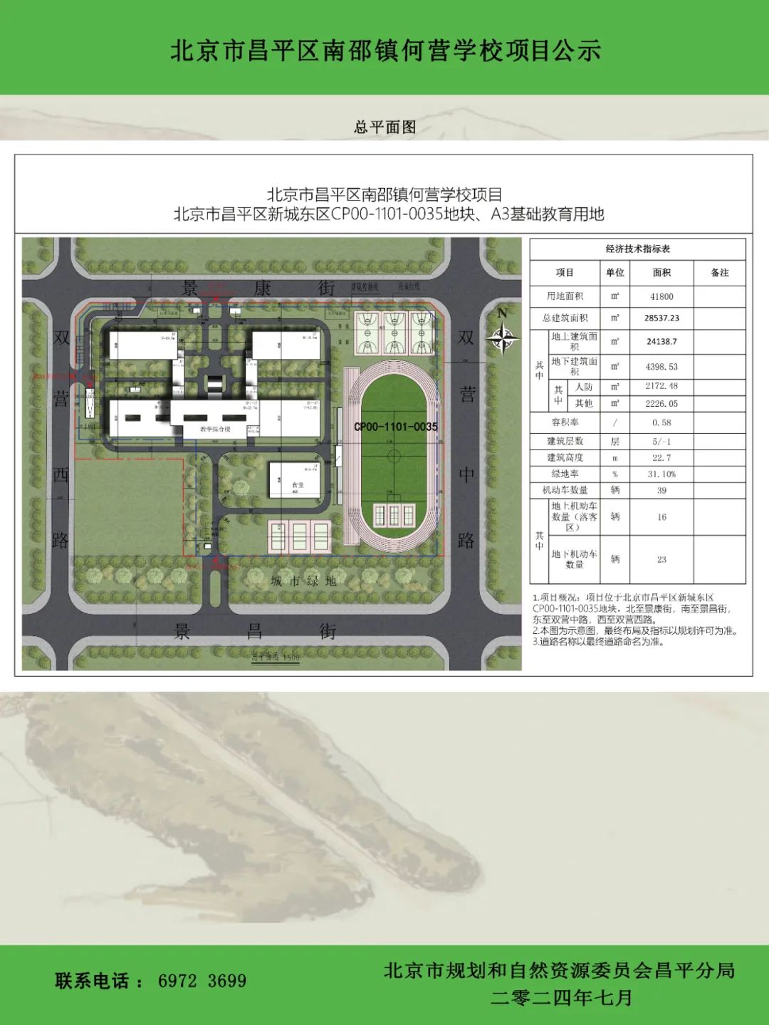 该项目位于昌平区南邵镇CP00-1101-0035地块,项目北至景康街,南至景昌街,东至双营中路,西至双营西路。总用地面积约41800平方米,规划总建筑面积约28538平方米, 地上建筑面积约24139平方米,地下建筑面积约4399平方米。容积率0.58,绿地率31.1%,建筑高度22.7米(详见总平面图)。最终规划指标和方案布局以规划审批为准。