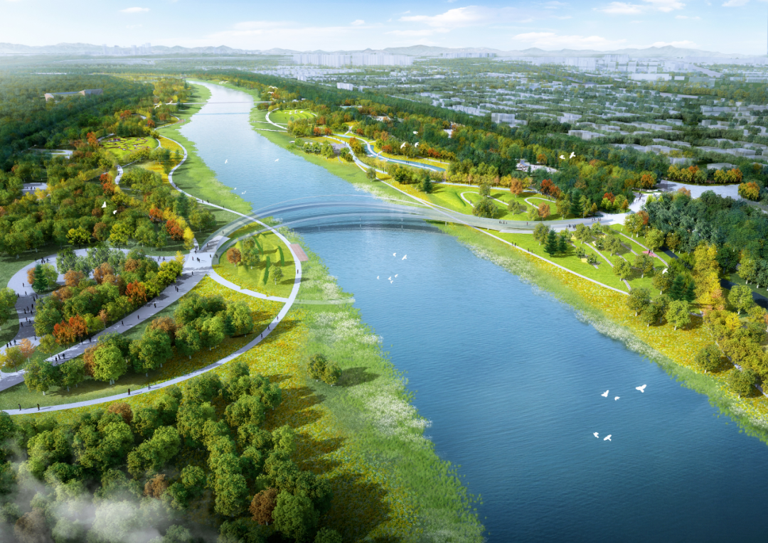 温榆河公园顺义二期城市生活画廊效果图,打造跨河慢行桥、亲水步道等景观设施。