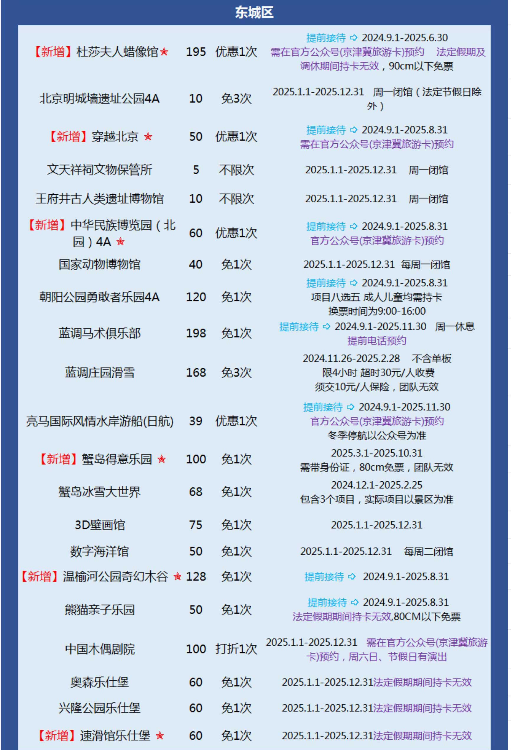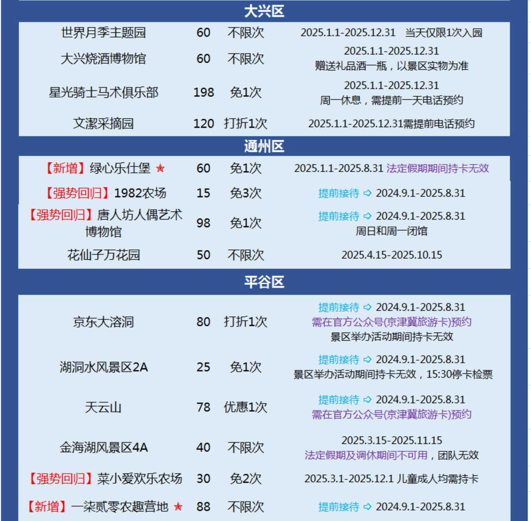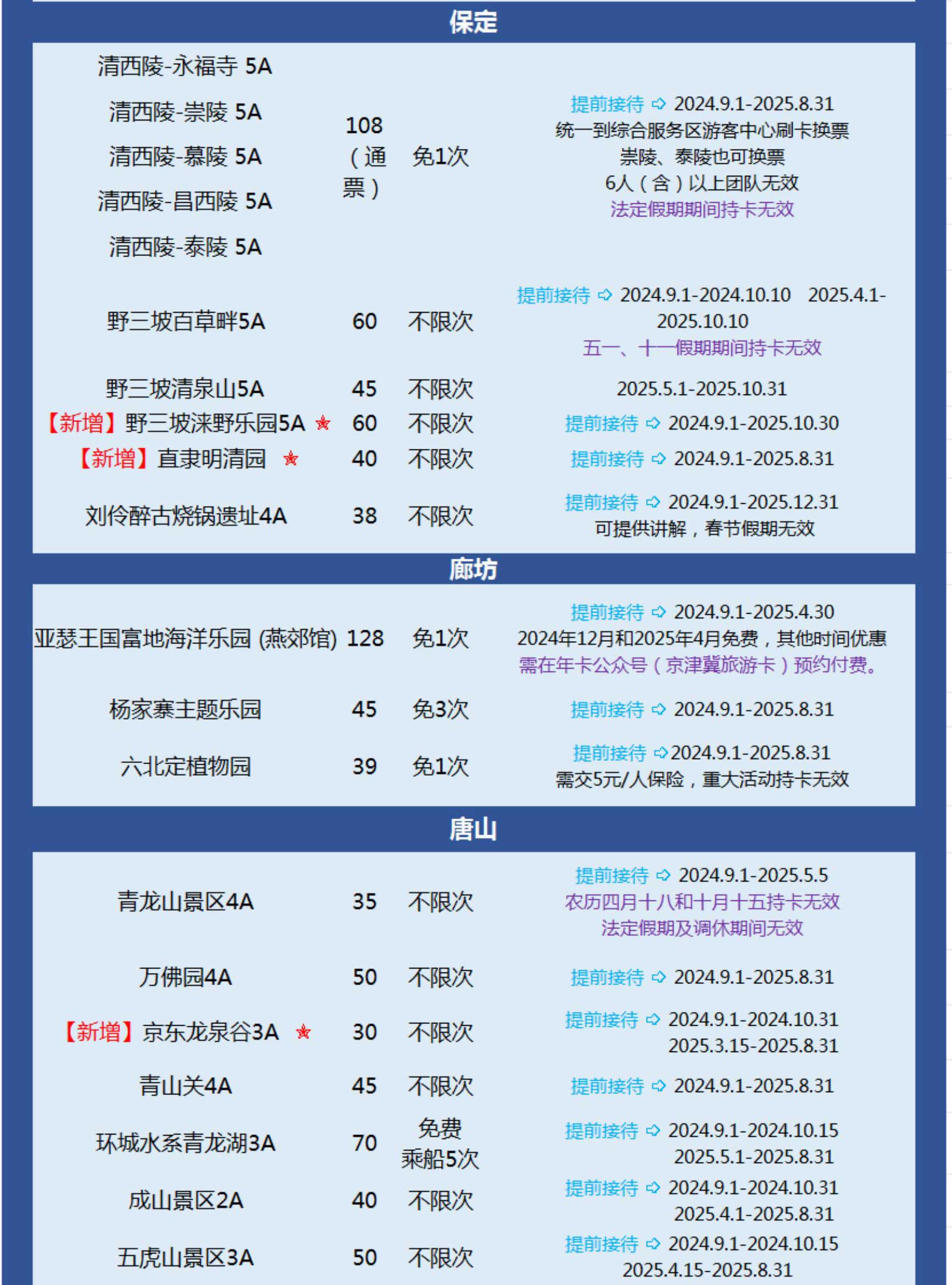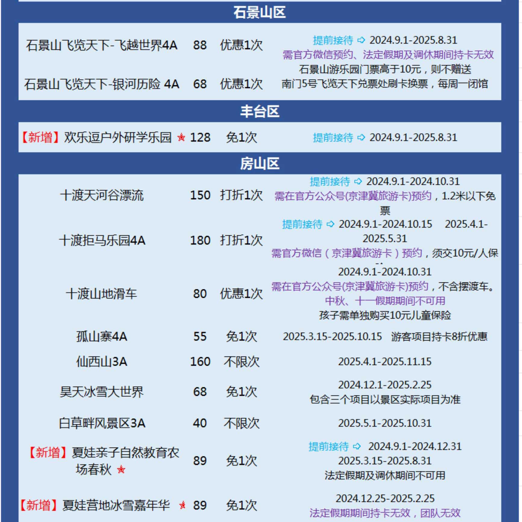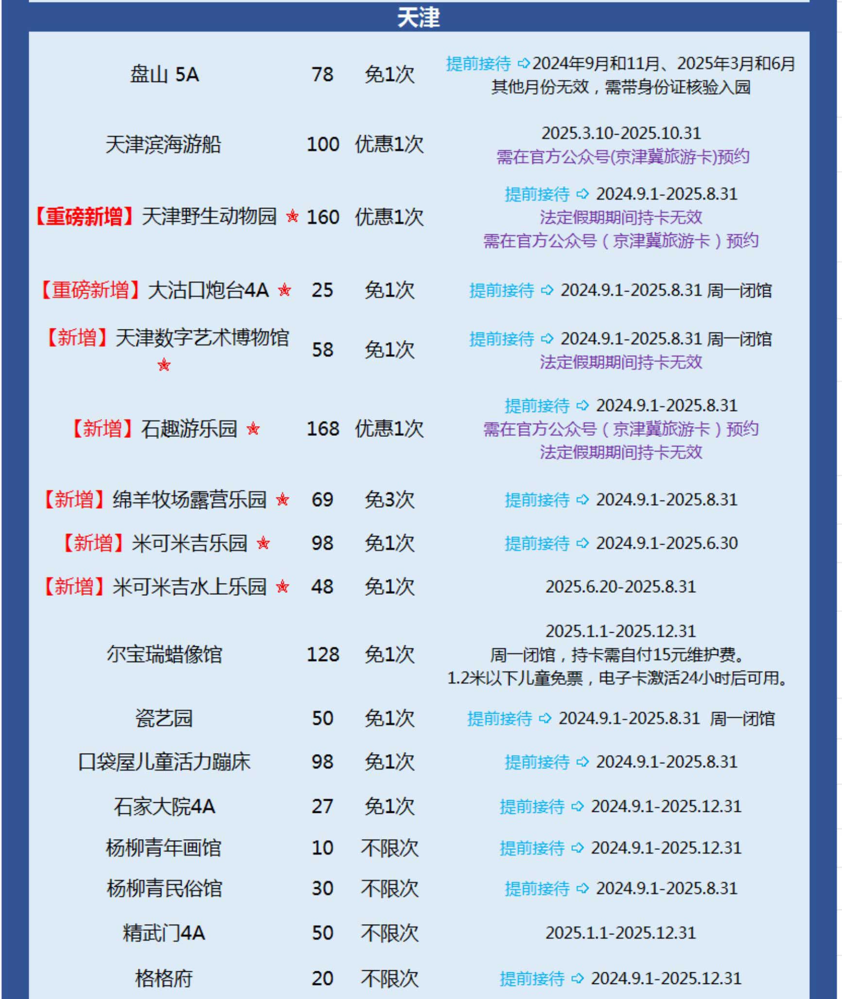 穿越北京、古建馆(先农坛)八奇洞、谷山村、蜂王谷石门山景区+探险星球乐园盛世京城大剧院、3D壁画馆、数字海洋馆萌·活力蹦床馆、造梦空间主题蹦床公园天津野生动物园、天津数字艺术博物馆大沽口炮台、石趣游乐园、绵羊牧场露营乐园野三坡涞野乐园、直隶明清园、六北定植物园南大港湿地公园、