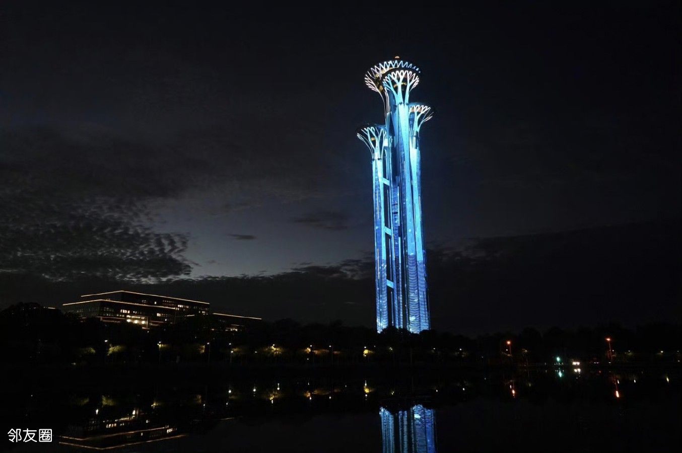 当夜幕降临,奥林匹克塔等建筑仿佛被赋予了新的生命。鲜艳的气球、飘带、粒子等元素在灯光的映照下,营造出首都北京喜庆迎宾的热烈氛围。五彩斑斓的灯光交织变幻,时而如璀璨星河般闪耀,时而如灵动的画卷般展开,为市民和游客带来一场视觉盛宴。