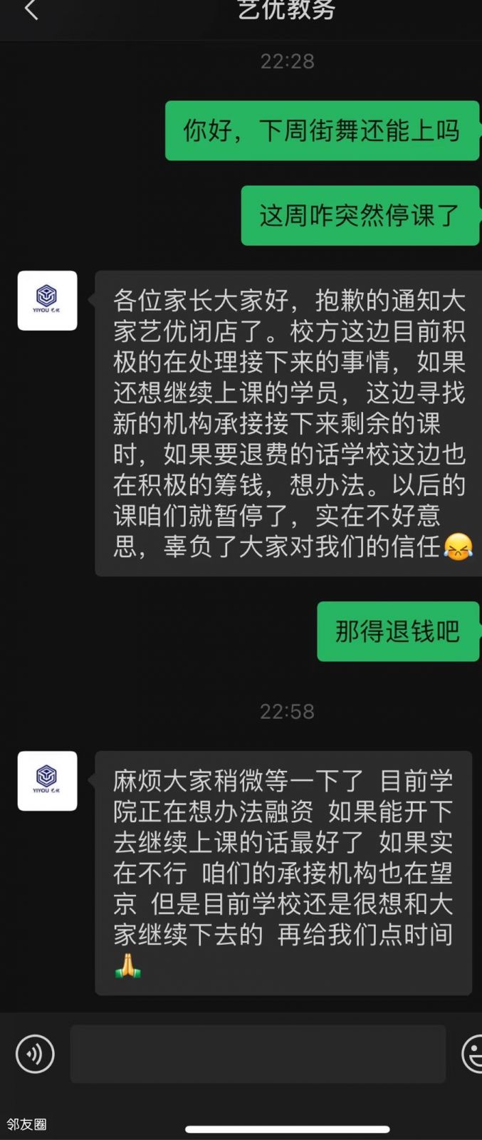 我真是万万没想到,望京SOHO的艺优也不行了。孩子上周末还去上课了,然后通知这周课暂停一次。没想到刚刚在邻友圈看到已经闭店的通知。还有不少课没上呢。。。大家千万别存大课包了,我因为也是手里没钱,每次都分期付款,但这次买了个半年的,也损失不少呢! #机构跑路 #机构闭店 #艺优跑路
